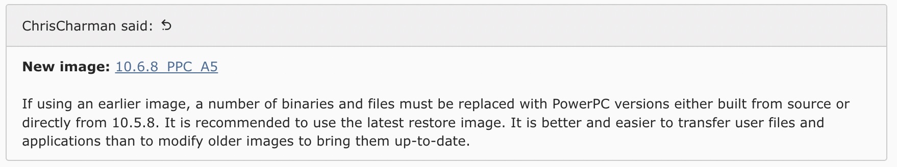 https://forums.macrumors.com/threads/10-6-snow-leopard-powerpc-development.2439769/ the very first post is basically a small wiki. Peruse through it for links to installers, extra downloads you might want, and various tabs including a "bugs/workarounds" tab. Hope that helps.Hmmm... OK, it would not come up. It boots, plays the opening music that accompanies the initial install screen, and then gets stuck and dies.