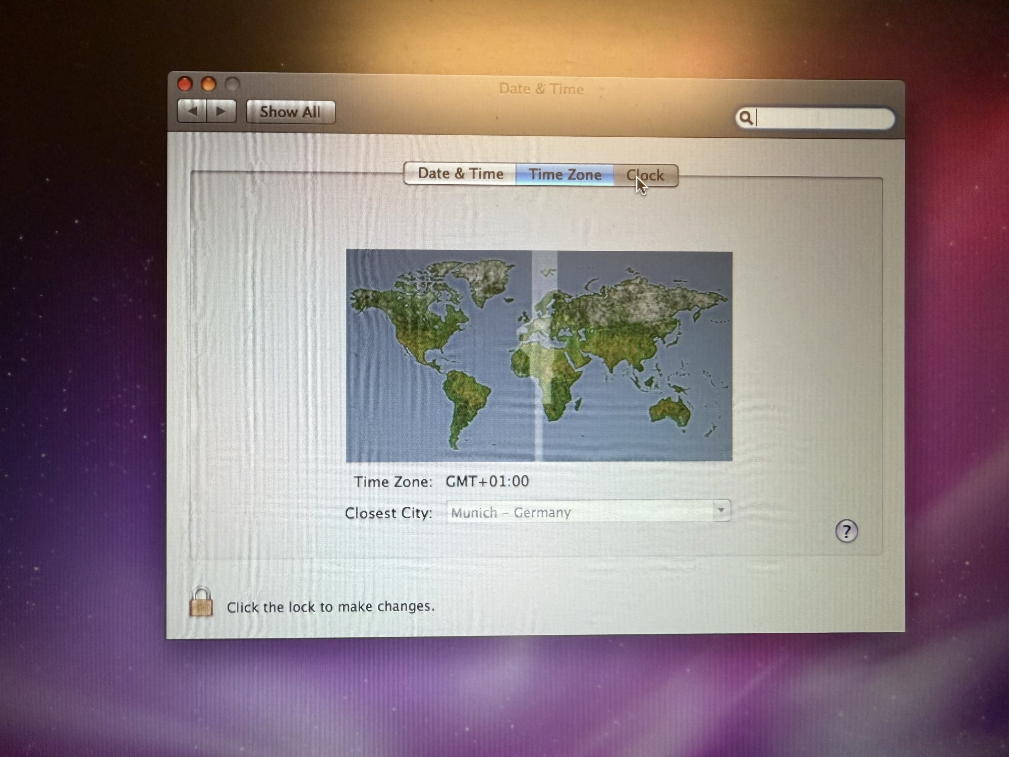 The clock system pref panel is a known bug. Time settings can be adjusted via command line until a fix is available.