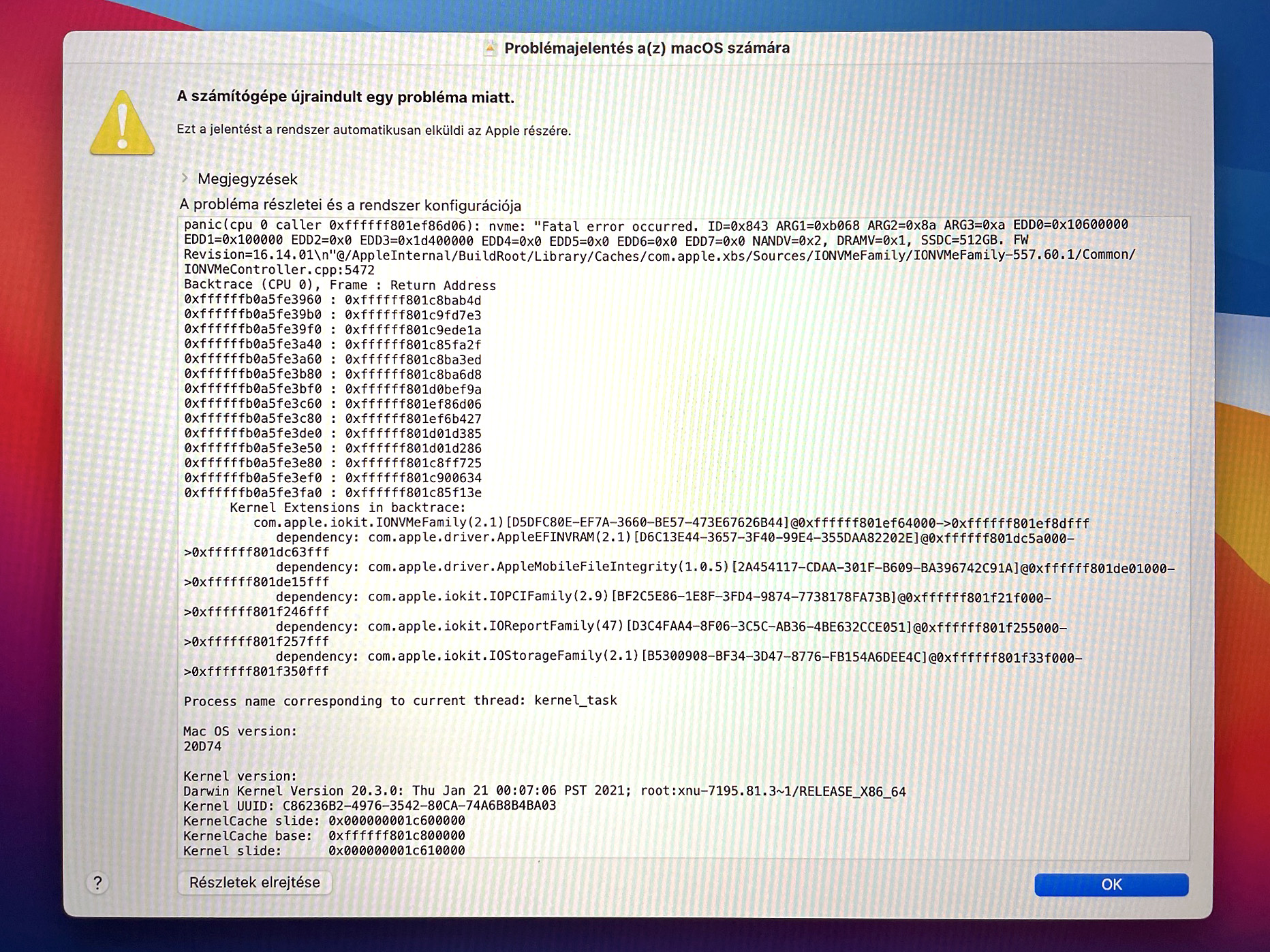 Lately I'm having some serious issues with my 2 yrs old 13" Macbook Pro (2017, with TouchBar, 4 Thunderbolts, 512Gb). It started about a year ago (while still on Catalina). When I left it in sleep mode for the night and I opened it in the morning I noticed that my computer restarted because of an IONVMeController related issue. It didn't disturb me too much back then, but in the last few months it started to crash on me during daily use as well.