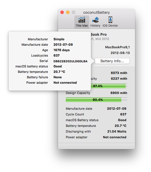 My 13" TB MBP started live (according to Coconut Battery) at about 104% Battery Health, as they all seem to. Now, though, after 19 charges, it's dropped quite considerably, alternating for the last couple of days between 98.3% and 99.1%.