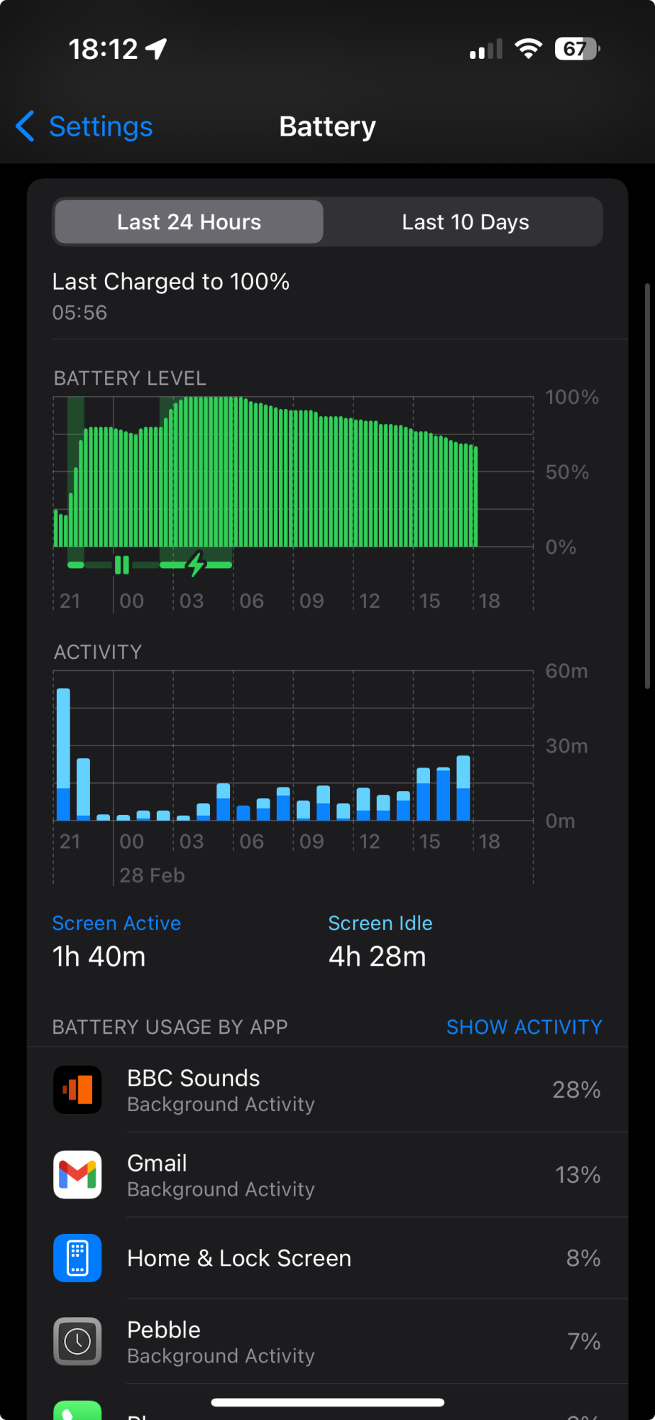 To be honest it doesn't look like a solid battery. Yes 12h but mostly having your iPhone on table or inside your pocket. You were barely using your phone and still you still lost 33%. If you touch it for a while you will lose even more. Yes there was some background sound activities but let's face it. Not that much. To me it looks the same as mine Pro. On mobile data max SoT is 3h.Come from a release day iPhone 12 to a release day iPhone 15 Pro and for me battery life is good. I can run it down in 12 hours or so if I hit it hard, but today it's been off charge since 05:56 and at 18:11 I'm still at 67% (admittedly with little use and being on strong wifi all day). 100% capacity and 168 cycles.