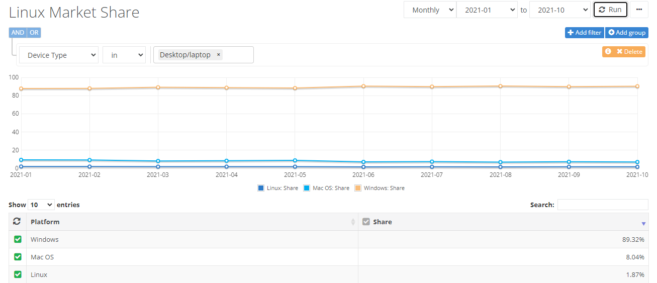 That's probably not the example you want to use for FOSS successes, because I don't believe you can call 1.87% a successSource I understand that Linux on the server market is a resounding success but we're we're talking about desktop and in that sector Linux is all but a niche OS. Don't get me wrong, I like Linux and have used it personally and in my work