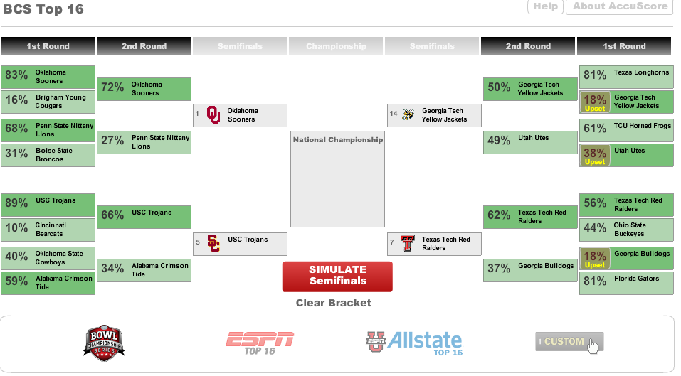 Still a playoff like this would be a lot of fun to watch, don't you think! It would also settle once and for all, which conferences/teams really are dominant in college football since they'd all actually be playing each other.