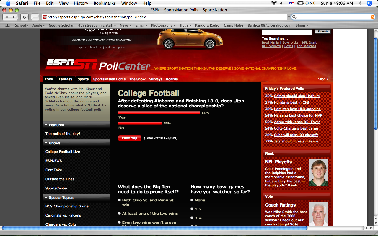 Hey they won didn't they, more than BSU could do against TCU so don't be so critical. At least we won and were able to remain undefeated, need I remind you that we're the only team this season to be undefeated at the end of it all. We have the longest current winning streak in the nation, the longest active bowl win streak in the nation. Won out in what's arguably the 3rd best conference in the country this year. whupped a national championship caliber team in our bowl, beat another team that will be top 10, whupped another that was as high as #7 and pasted UCLA 59-0 (who USC only beat 28-0). Beat a team that is historically a perennial powerhouse in NCAA football at their home stadium, a stadium filled with almost 100,000 hostile fans. And again were the only team to do all of this and go undefeated through the entire season. We beat a top SEC team, a top Pac 10 team and a team who usually is a top Big 10 team. Along with every team in our conference (which is a very tough conference this year). If that doesn't warrant a chance to play for the title (notice I say play for the title no be given the title, even though that's what happened with OU and FU this year) than I want to know what does.