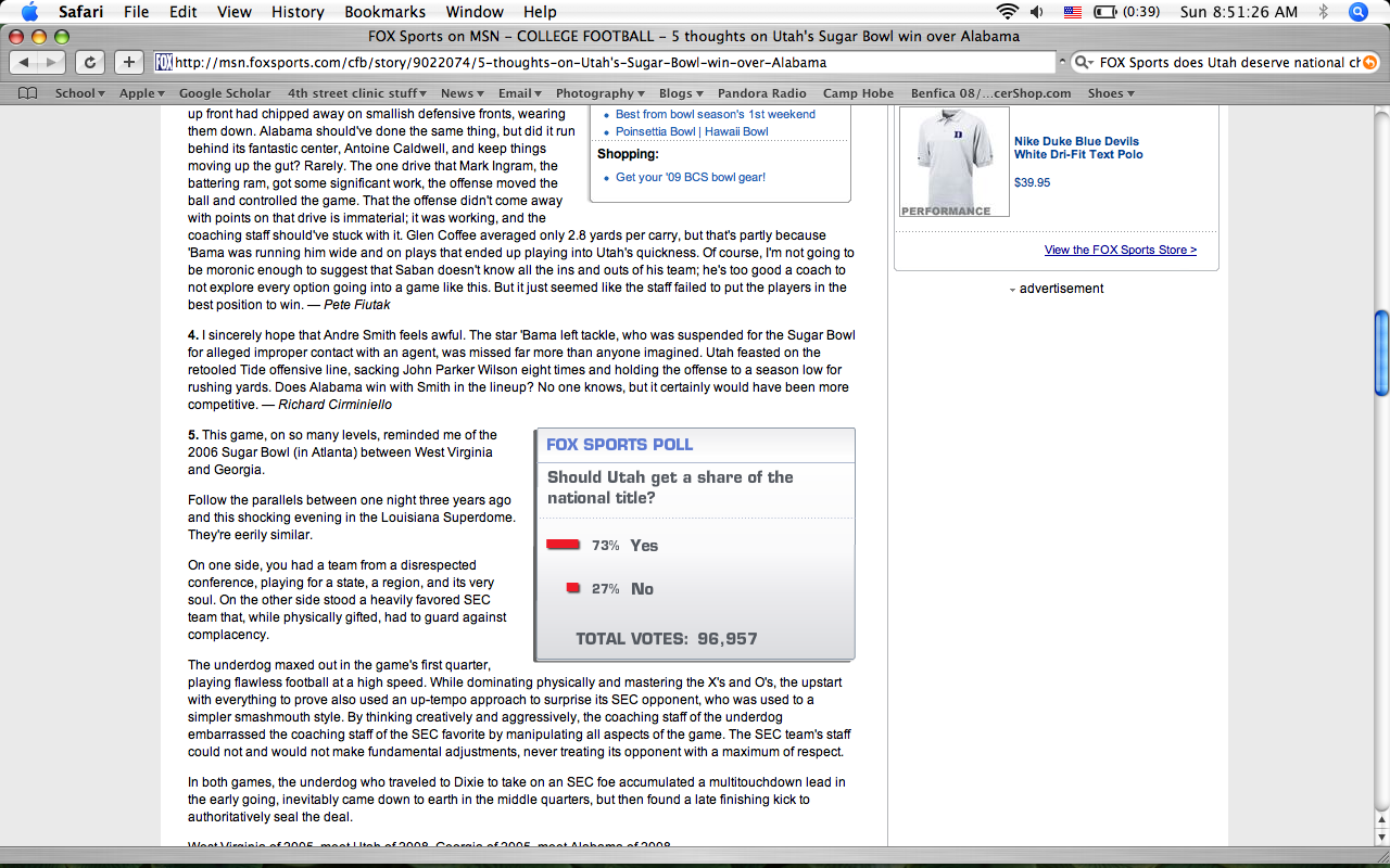 And apparently I'm not the only one who feels this way, you who say Utah doesn't deserve it are very much in the minority. On Fox sports there is a poll going asking whether or not the Utes deserve a shot at the title. So far there are over 95,000 votes and 73% of them say yes! Look at the comments following any story about the Utes and you'll see the same thing.