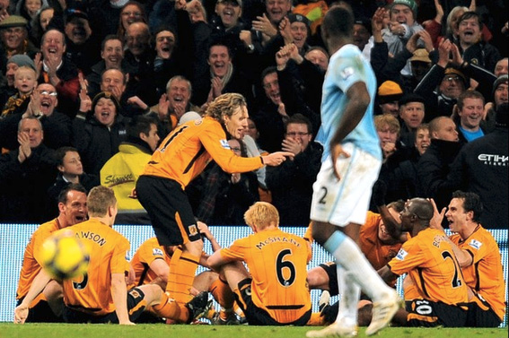 BBC said:Hull goal: The ball spins off Joleon Lescott in the Man City area - did it hit his hip, or an arm? Referee Lee Probert decides it was the latter and points to the spot. Controversial. Jimmy Bullard steps up to smash the penalty home and celebrates by imitating Phil Brown's half-time team-talk from last year - his team-mates all sit down to listen. Classic - not that Mark Hughes will have enjoyed it this time around.