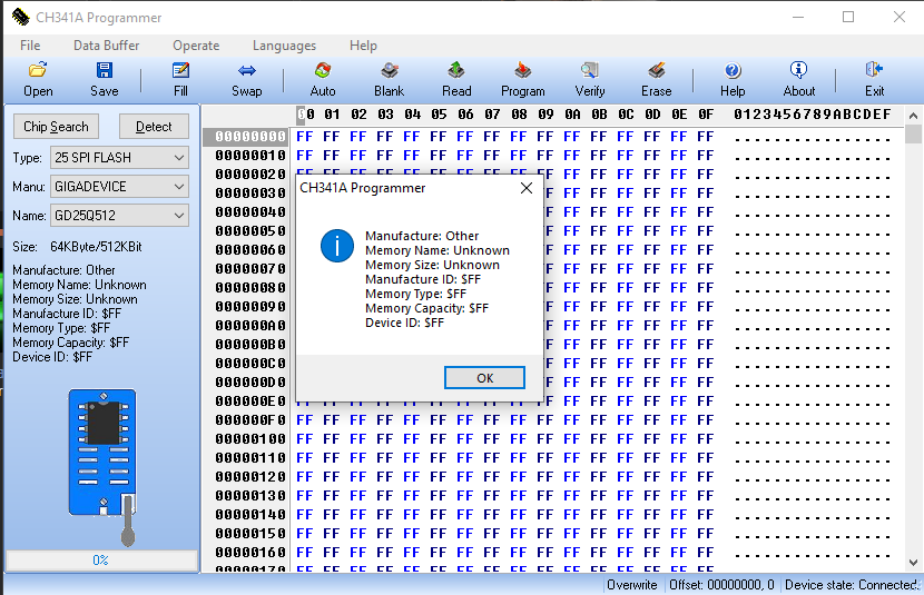 When I click detect I get this with my version of the software, if I scroll through the "Name" section on the left it doesn't appear like the "gd25q0t" you mentioned above.