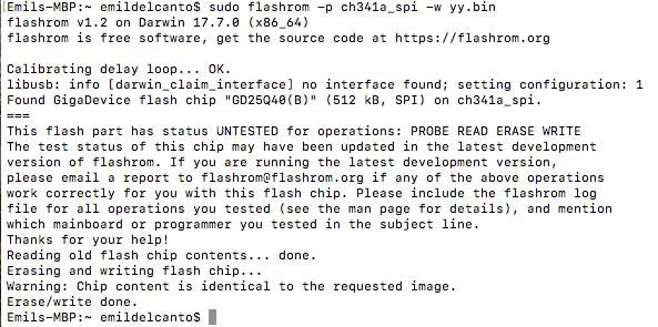 I think yy.bin is just an example or something maybe used in that video. I was hoping it might even be the backup (though I was wondering why there was no .rom extension), I really don't know though. Check the end of that vid to see what I mean. I def didn't write anything new to the eeprom. I just read what was on it using command "sudo flashrom -p ch341a_spi -r yy.bin" and it saved to yy.bin in my user folder. Then went to write using command "sudo flashrom -p ch341a_spi -w yy.bin" to test and it said it was identical. I'm trying to confirm the commands for backing up the firmware and then writing the rom I attached in my last post.Looks like you already wrote the firmware to the eeprom... what is yy.bin?