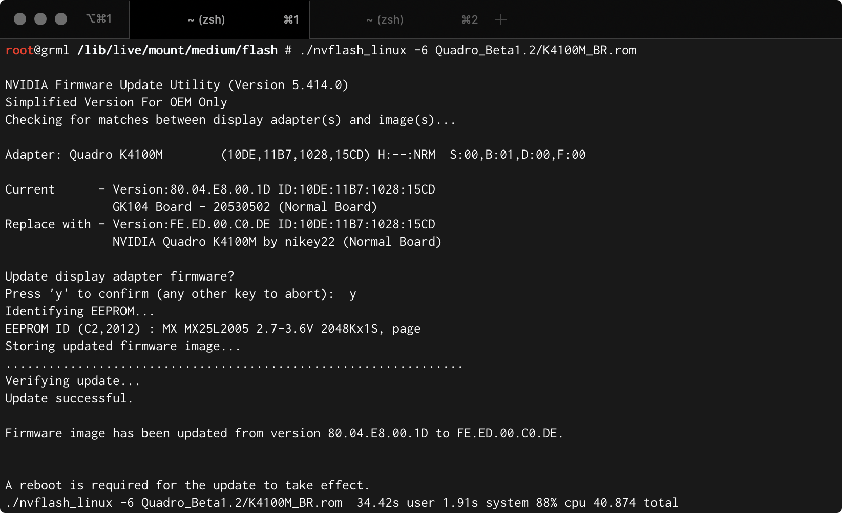Yes, of course!I have installed a Nvidia Quadro K4100 on my iMac 27" and Flashed with Linux over SSH with the room on NVIDIA Quadro K4100M Mac Edition ROM post as the instructions say, the command line said that the firmware was updated so I reboot my iMac but now that I turn on my iMac it only chimes with a black screen and reboots and nothing happens, I just keeps rebooting and chiming and I don't know what I did wrong, am I missing something?