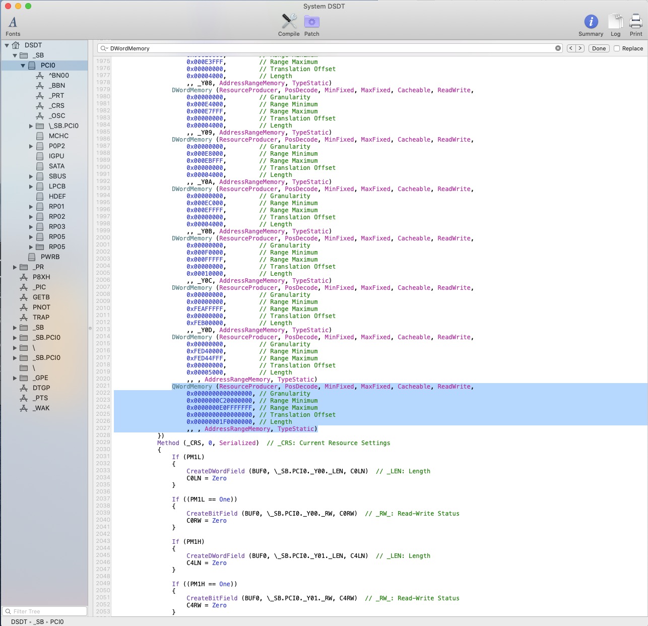 Code:QWordMemory (ResourceProducer, PosDecode, MinFixed, MaxFixed, Cacheable, ReadWrite, 0x0000000000000000, // Granularity 0x0000000C20000000, // Range Minimum 0x0000000E0FFFFFFF, // Range Maximum 0x0000000000000000, // Translation Offset 0x00000001F0000000, // Length ,, , AddressRangeMemory, TypeStatic)