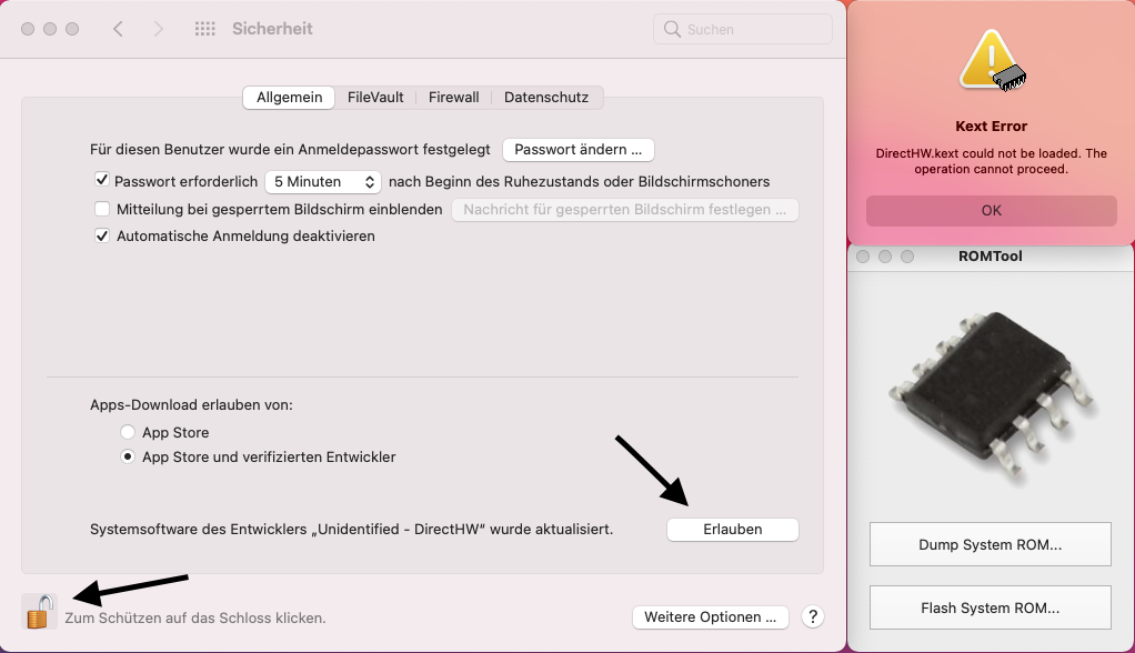 When I start up romtool for the very first time on a new Big Sur installation the system asks me to allow romtool to load the third party kext within the security pref pane. This is not a modal dialog and sometimes the window/message got buried under a load of other open windows and messages. And this is different from the other macOS version, where this message does not come up and romtool just crashes the system when loading it.