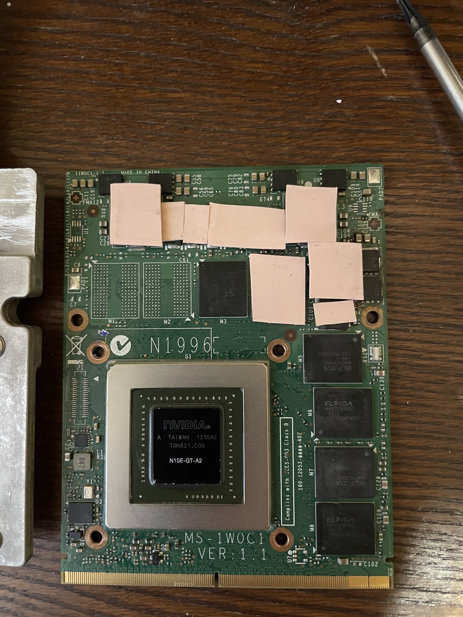How to prevent knocking off this component again: Insert a hard plastic card (bank card, etc.) under the metal frame before shaking the MXM card out of its position.