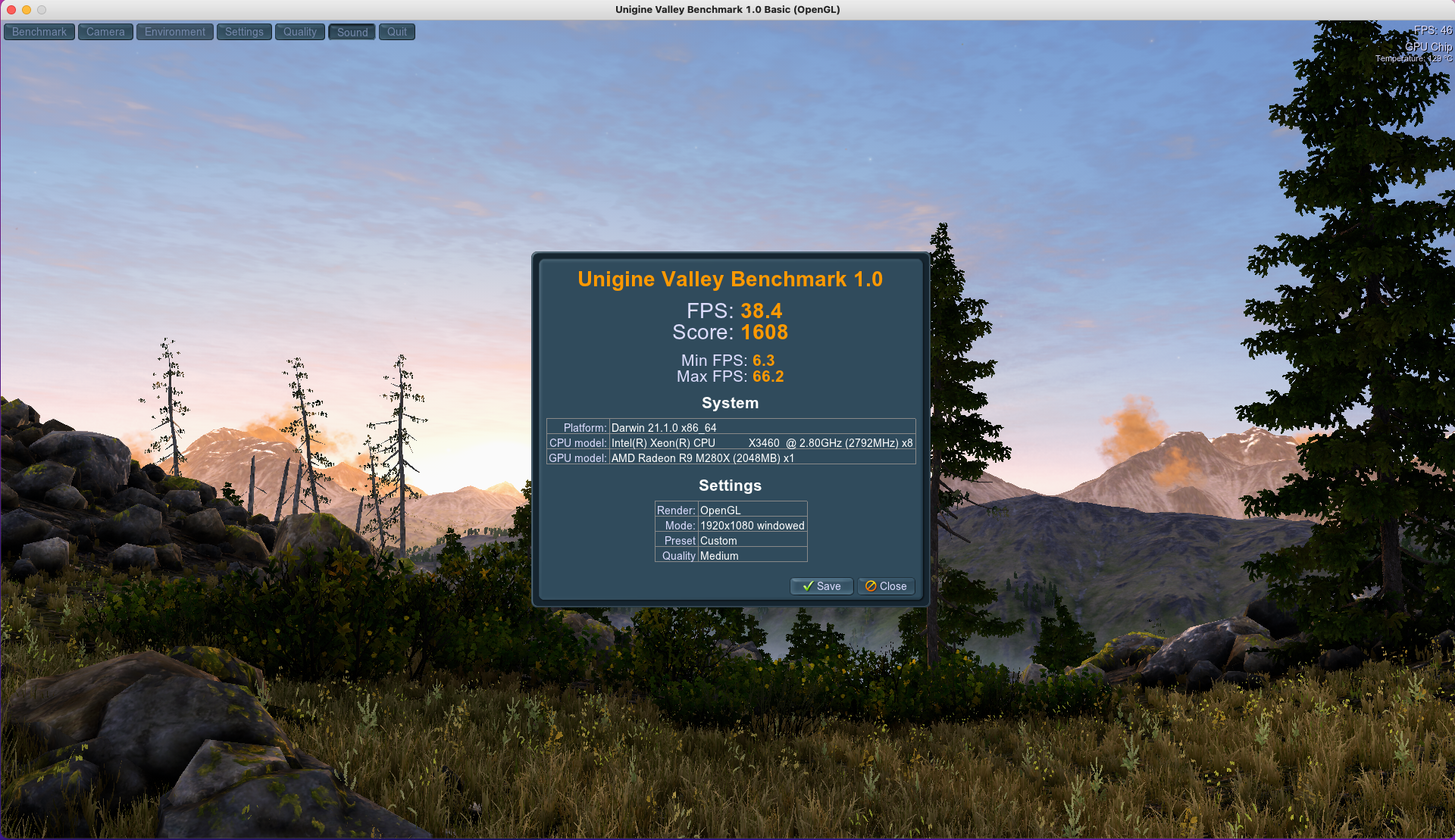 Mac OS X 11.6 - Valley - 1696, FPS 40.5. Metal Bench - 110-167 MRays