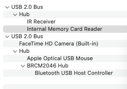 Check inside the SD card connector socket, I once bent a pin in there and until I took a close look under a magnifying glass I had no idea it was bent.I've just discovered that since doing my upgrade I've lost my SD card reader and my outermost USB port provides power but seemingly no data. The USB device tree in System Report is missing the Internal Memory Card Reader and the IR Receiver, as seen in the attached screenshots comparing the upgraded 27" with a stock 21.5" 2011. I've opened up the Mac and reseated the relevant connectors but the the problem remains. I'm running Big Sur, but it's also still present when booting into High Sierra.