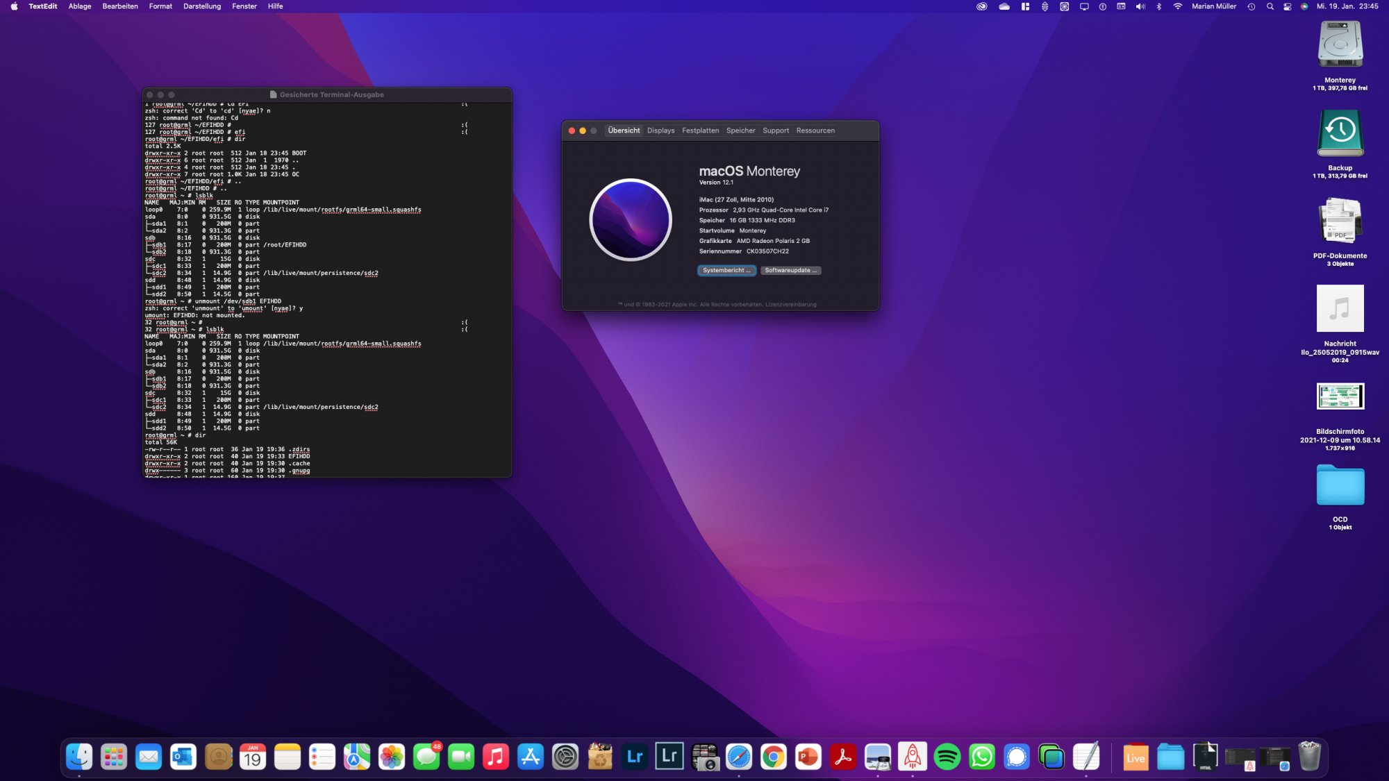 - I booted iMac11,3 from Linux Grml and connected via SSH from my second iMac12,1. On Grml command line I mounted the EFI from SSD disk and the EFI from SD-card. I removed the existing OC Folder on SSD EFI and copied the EFO folder from SD card to SSD.
