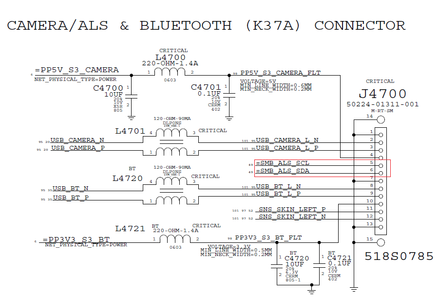 The J4700 connector controls the Camera, Bluetooth data and ambient light sensor: