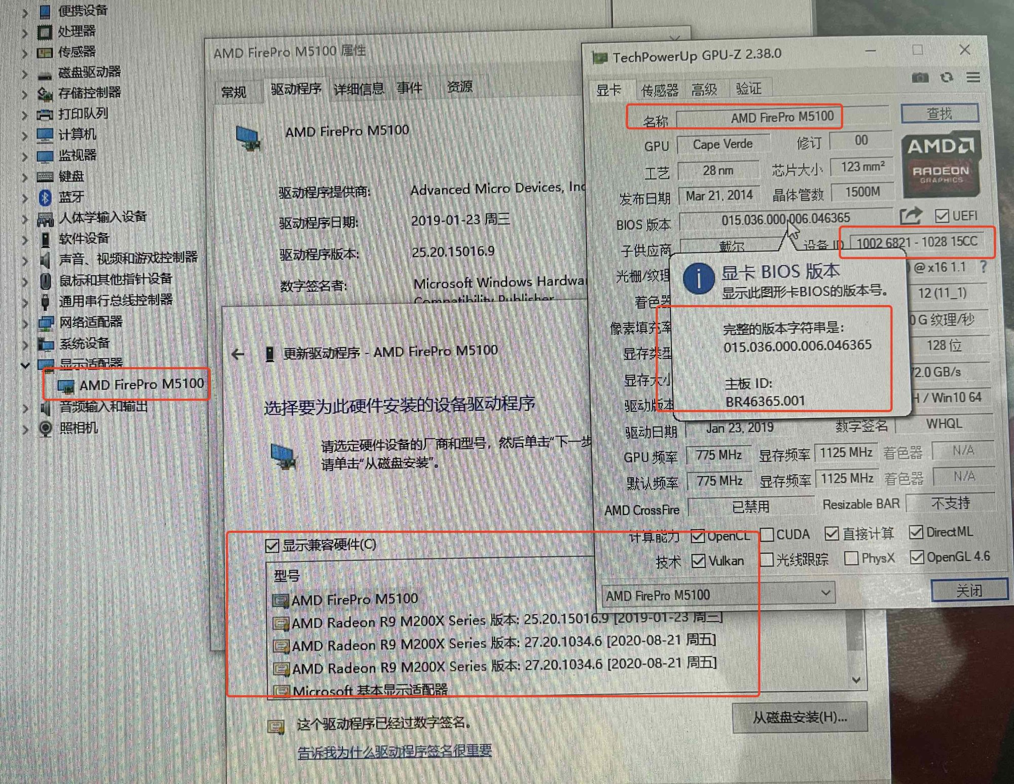 Check vbios information Dell driver ID 28 10 CC 15 and windows match the M5100 driver ID matches