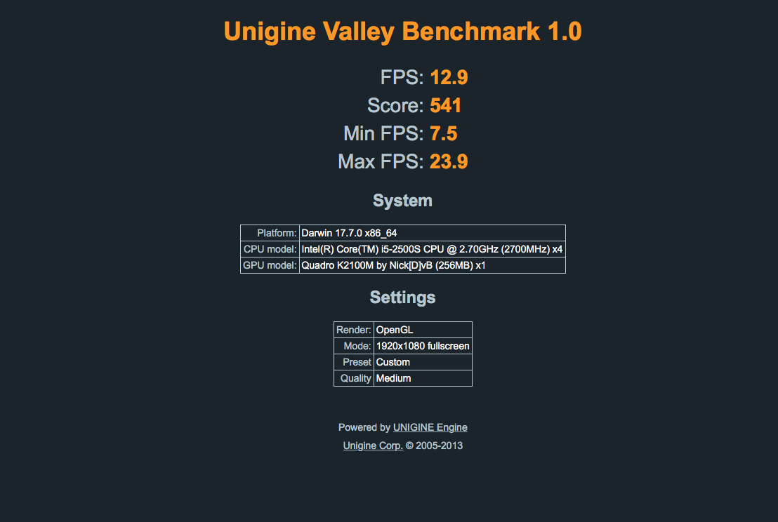 I ran the benchmark again twice - full screen and windowed with activity monitor running. Same result, 550 vs others around double that. CPU was around 50% generally, occasionally as low as 40% and peaking at 80% a couple of times. All temperatures were quite low, as I only just booted up prior to running the benchmark.The amount of memory shown by the Valley benchmark is irrelevant and simply wrong for some cards - so no problem here.