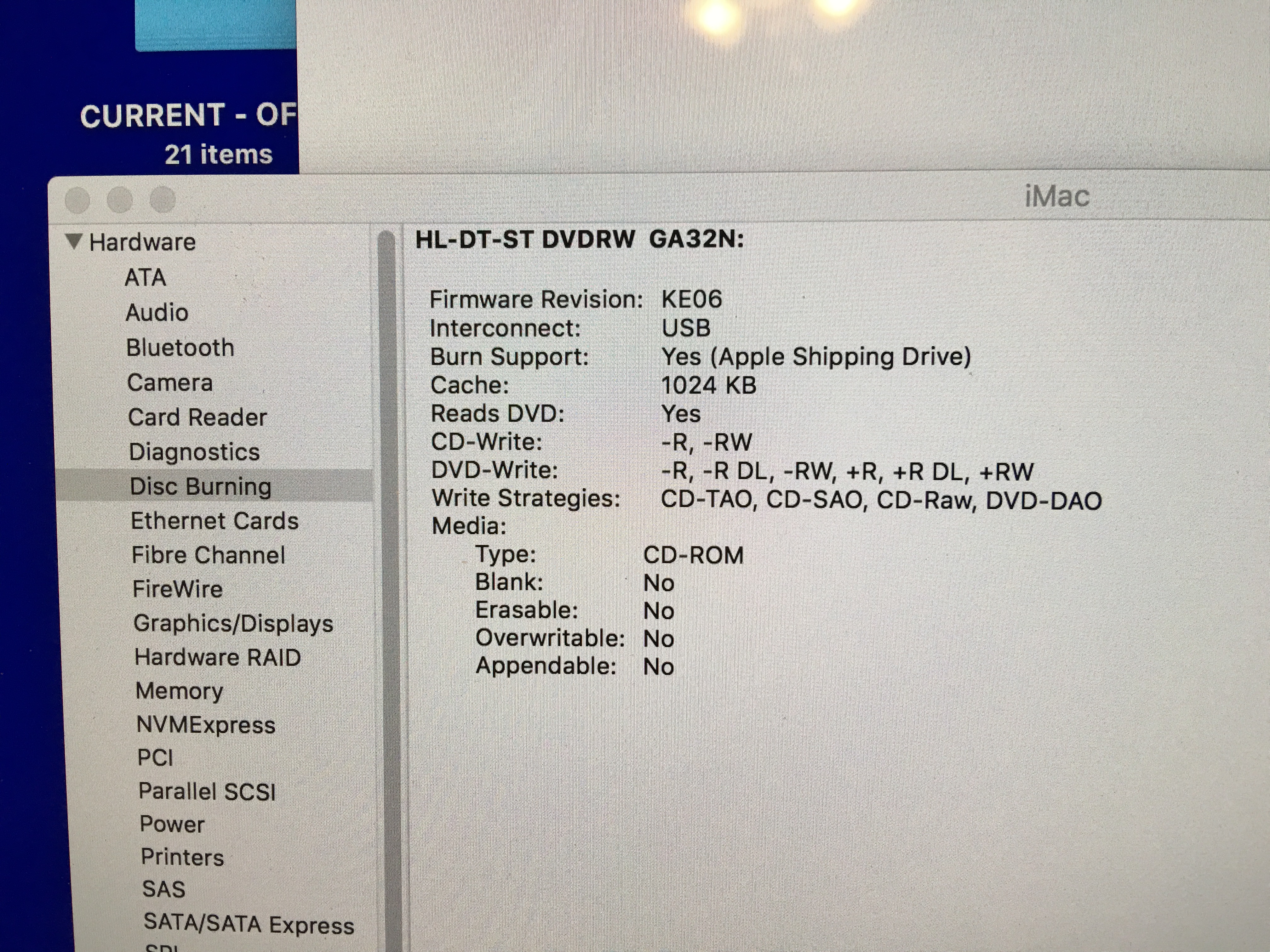 I plugged the drive into the 2014 USB. Drive has power and inserting a cd went fine. Sounds from the drive indicated normal activity, but no drive icon appeared on 2014 desktop. Without any further actions from me, got a dialog box saying this disk unreadable on this computer (I tried several store bought disks). The dialog box contained offer to eject which I clicked on and the disk ejected normally.