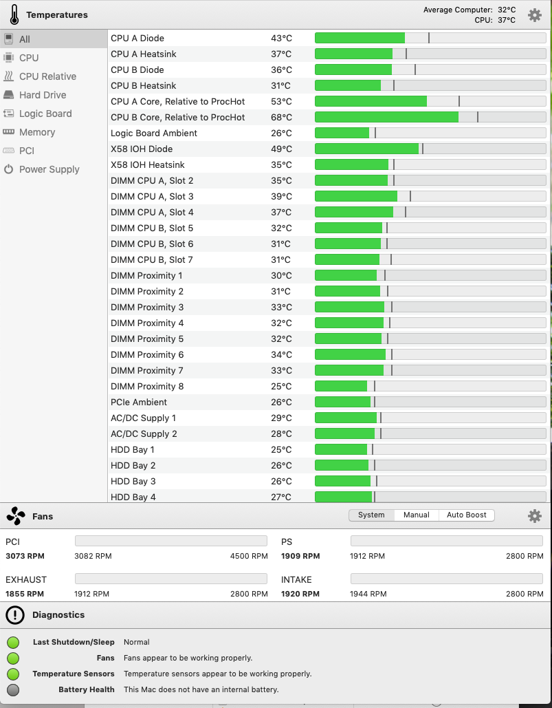 I have attached a screenshot of the TG Pro temps. The temps are all running in the 35 to 50C range.