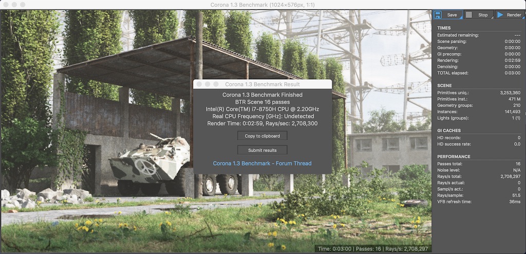 Hey, I got way better than this, 2:59, 2708k rays/sec on 8750h MBP. Maybe majority of those results are from the days before the throttling patch, or there is indeed just such a huge disparity in Apple quality between individual machines. View attachment 794345