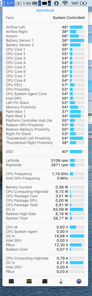 Are u using left TB3 ports to connect external monitor? If yes - its known issue with left TB3 ports, try to reconnect monitor to the right side. As for me, I have i9 2.4Ghz 32Gb Ram 5600m and with external Samsung monitor 3840x1200@120Hz, I have next results on browsing mode. Also I have turned off TurboBoost, but in case of browsing - there is no difference in temperatures with TurboBoost on or off.hello,yesterday i received my 16”mbp i9 2.4 64gb with 5600m.Its connected to my 27"asus 2k 60hz monitor , i see fans idling around 3200 rpms and it bothers me.As i read the 5600m shouldnt have this problem.Any ideas?View attachment 954974