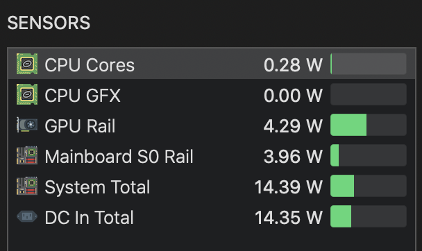 I installed Temp Monitor, and it shows GPU power 6.7W for internal + LG5k, and 4.3W for LG5k only in clamshell mode.I got my i7 5600M model today. After install latest version of iStat Menu, it shows only one temperature sensor for the SSD. Not sure why. Emailed technical support.