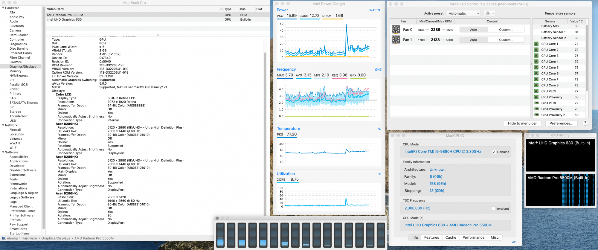 Try the same setup with only ONE monitor connected (clamshelled) and you will see the difference in temps.I'm running lid closed now, no noticeable increase in temps. Always have Mail, Messages, Safari, and Chrome open. Added Activity Monitor, Intel Power Gadget, Macs Fan Control (same as previous screenshot.) Playing same YouTube video as before - and I'm even a few degrees cooler right now.