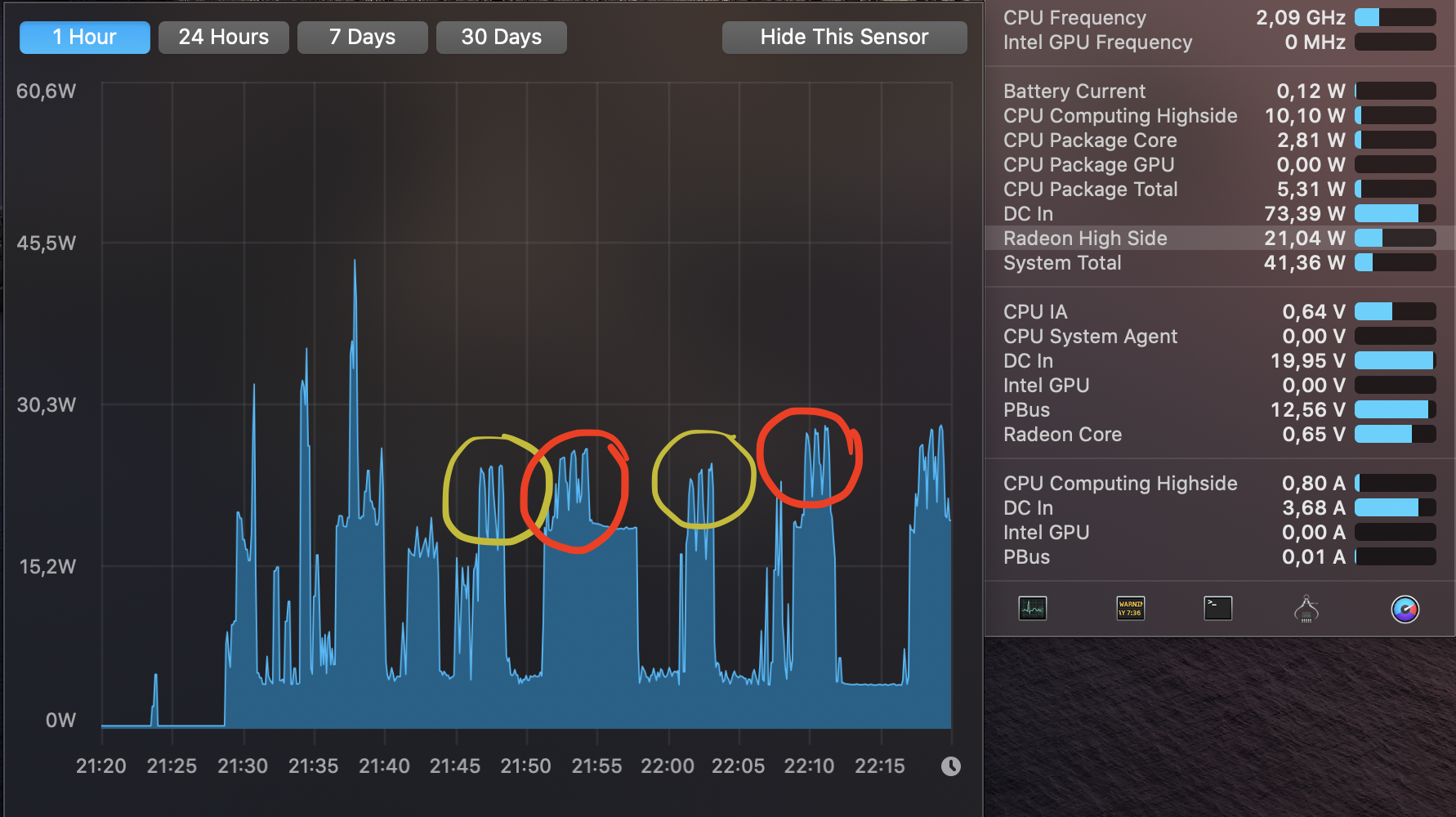 - Watching a Youtube video (the Hermitage video on Apple's channel) at point [5] increases the fan speed but then it starts to stabilize at around 3300RPM (subjectively speaking, this is when I start to notice the sound of the fans).