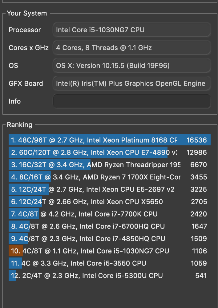 | Pre mod (10.15.5) | 1159 | -0.77% | 2926 | 5.10% |
