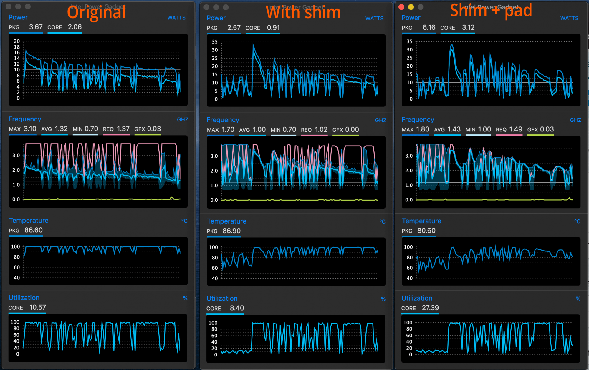 The heat profile also proves that heat is transferred properly. The frequency (light blue) during early low utilization part of the test caught up the requested one (pink) than shim pad alone. And heavy load part is better also (though heatpad mod is better because the heatpipe and fan speed capacity). You can find the comparison quoted from DanSilov thread below.
