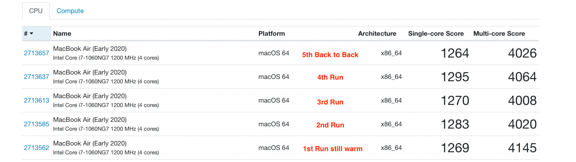 I've recently received new and shiny MBA 2020 i7/16GB/1TB to replace my much loved and trusted MBA 2015 i7. But I was very disappointed to find out the extent of the throttling issue — my single-core Geekbench scores varied between 1100s and 900s after multiple runs, which is a big difference, considering that my old MBA 2015 consistently pulled ~850 on the single core. Soon I found this thread and decided to try the copper shim mod.