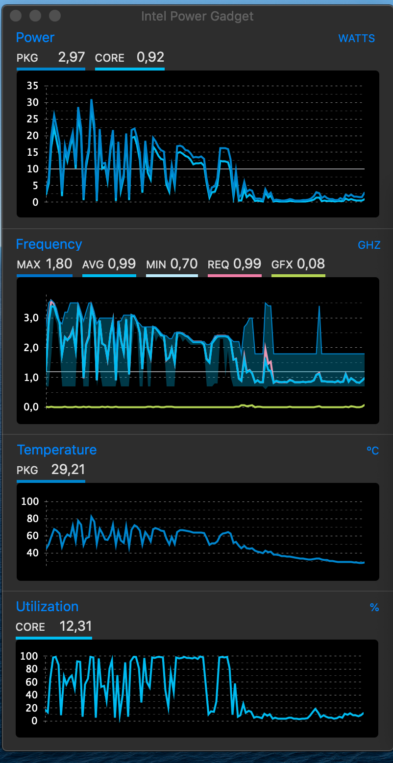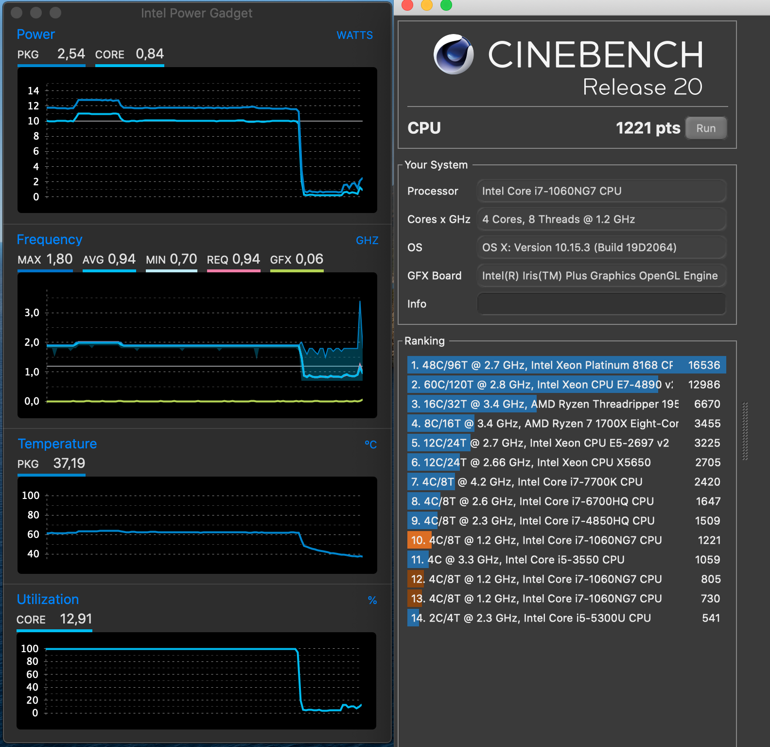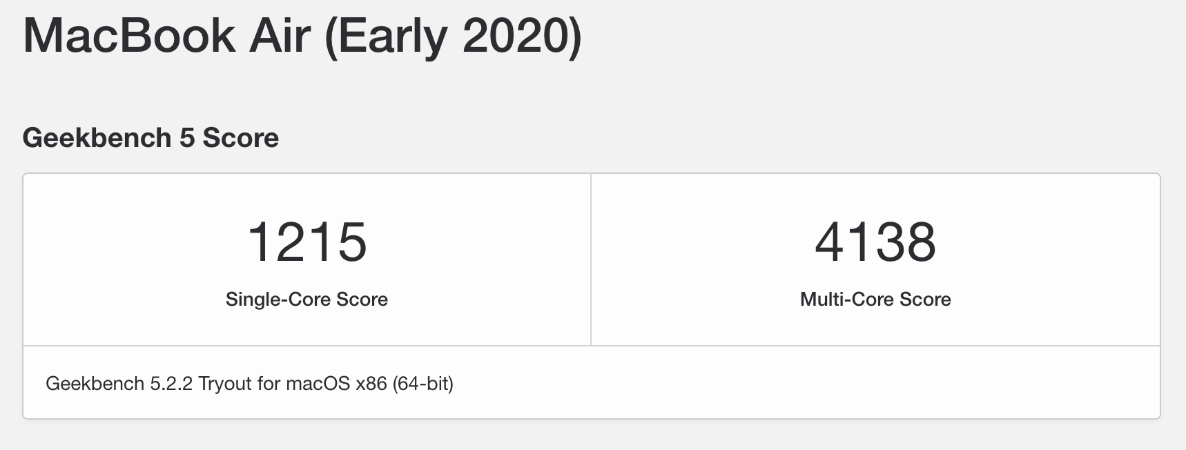 However, I’m trying to figure out what’s happening with the results above. On a four core MBA 2020, GeekBench should complete in 2:22-2:25 for a modified computer. The time here is showing 4:27 and it’s not completed yet. The power consumption should be >10 watts during 100% CPU utilization. Are you using some software to limit turbo boosting?