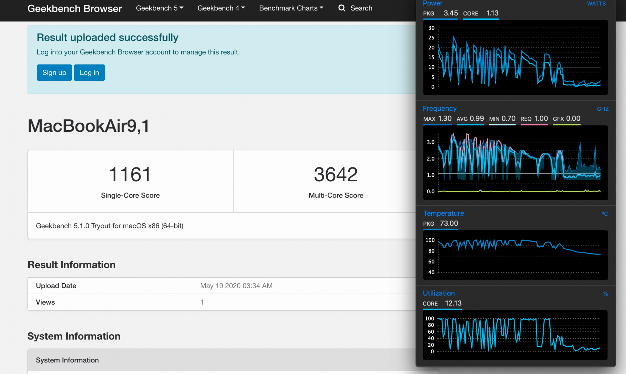 The next change was the removal of the thermal insulator on the bottom cover, with the insulator removed there was less heat transferred to the bottom case and the temps seemed to drop much faster when they did spike due to usage demands. Slight increase in scores over in GB5 and during sustained loads (parallels Win10 (idling on the desktop), Safari 4 - 7 tabs) temps never stayed at 100C very long and once normalized sat around 88C give or take a few degrees.