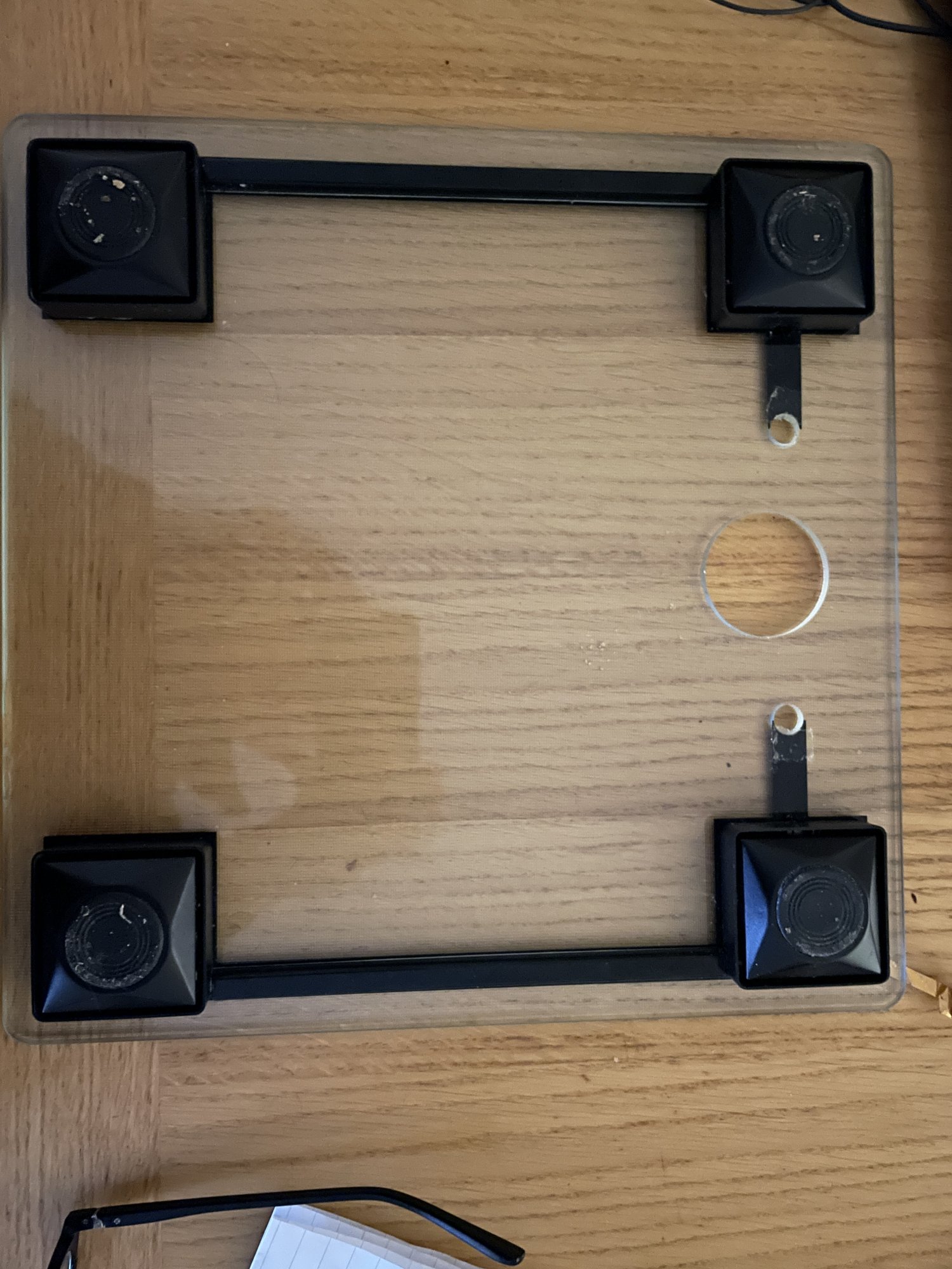 I was having a general clear out / tidy up recently and came across a set of Electronic Bathroom Scales. These were an inexpensive set we purchased years ago from Tesco. They're the sort with a LED Display mounted in a heavy Glass base, with the load sensors being mounted in the four corner mounted feet. After I stripped out the electronics for recycling I realised that the scales were the perfect size and height to act as a laptop stand for my i5 2020 Air.