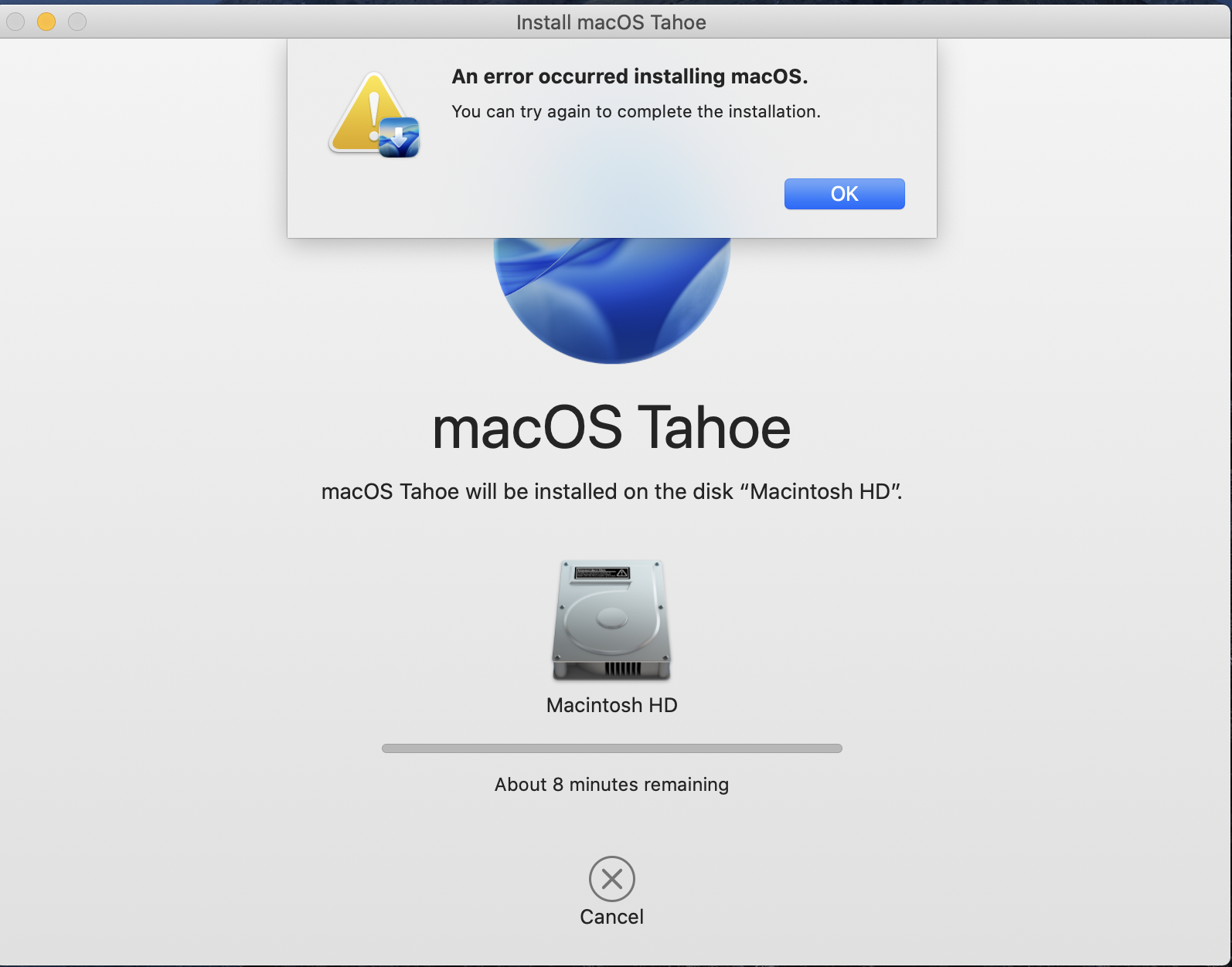 First thing I did was boot into Internet Recovery (Option-Command-R for the latest version of macOS that's compatible), erase the internal HDD and then attempted to reinstall macOS onto it. If I recall correctly it already has macOS 15 Sequoia installed and this is the version that Internet Recovery was attempting to reinstall. I attempted this five times and every time it failed with the same error message.