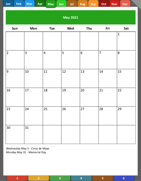 Along the top are tabs that take you to the beginning of each month. The dog-ear in the upper right corner will take you back to the cover from anywhere in the notebook. (helpful when you are on a page with confidential information and need to hide it quickly)