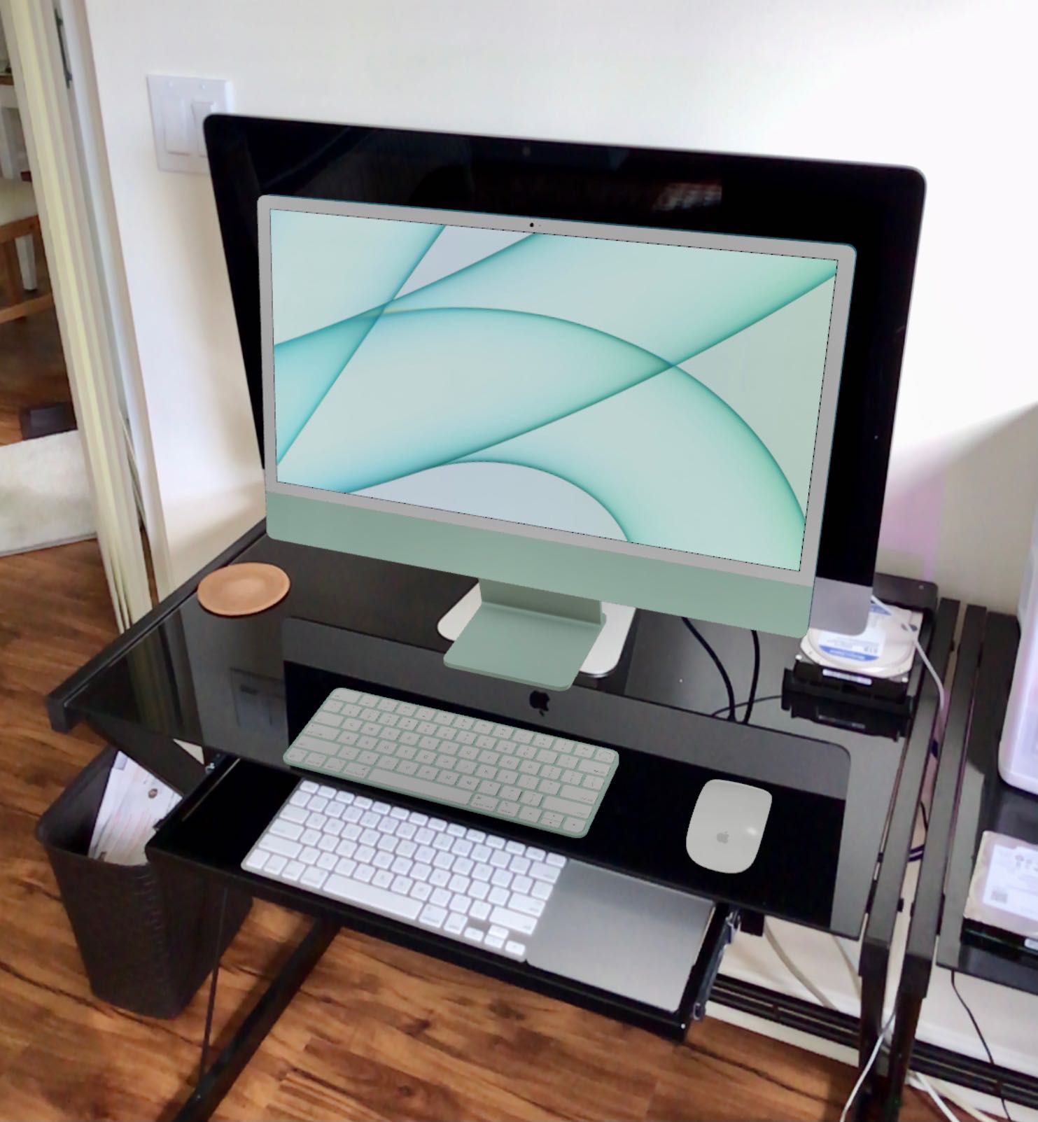 Here's my feeble attempt to use Apple's AR tool to simulate what my new iMac will look like on the desk, compared to my old 27" model. Brings up a question, are the keyboard and mouse going to be light gray like the screen bezels or is this just a lighting illusion?View attachment 1770407