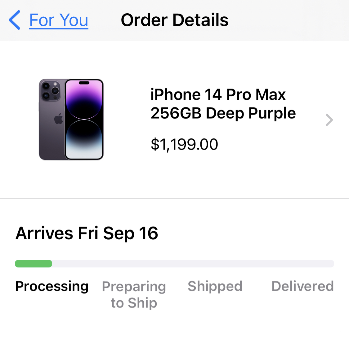 I ordered mine at exactly 8:03 am, and I'm not getting it until 9/23. š„²Woke up normally at 6 AM EST, order at 8:02 AM EST and YES!!!? Got my IPhone 14 ProMax 256 GB drop purple next Friday ššš