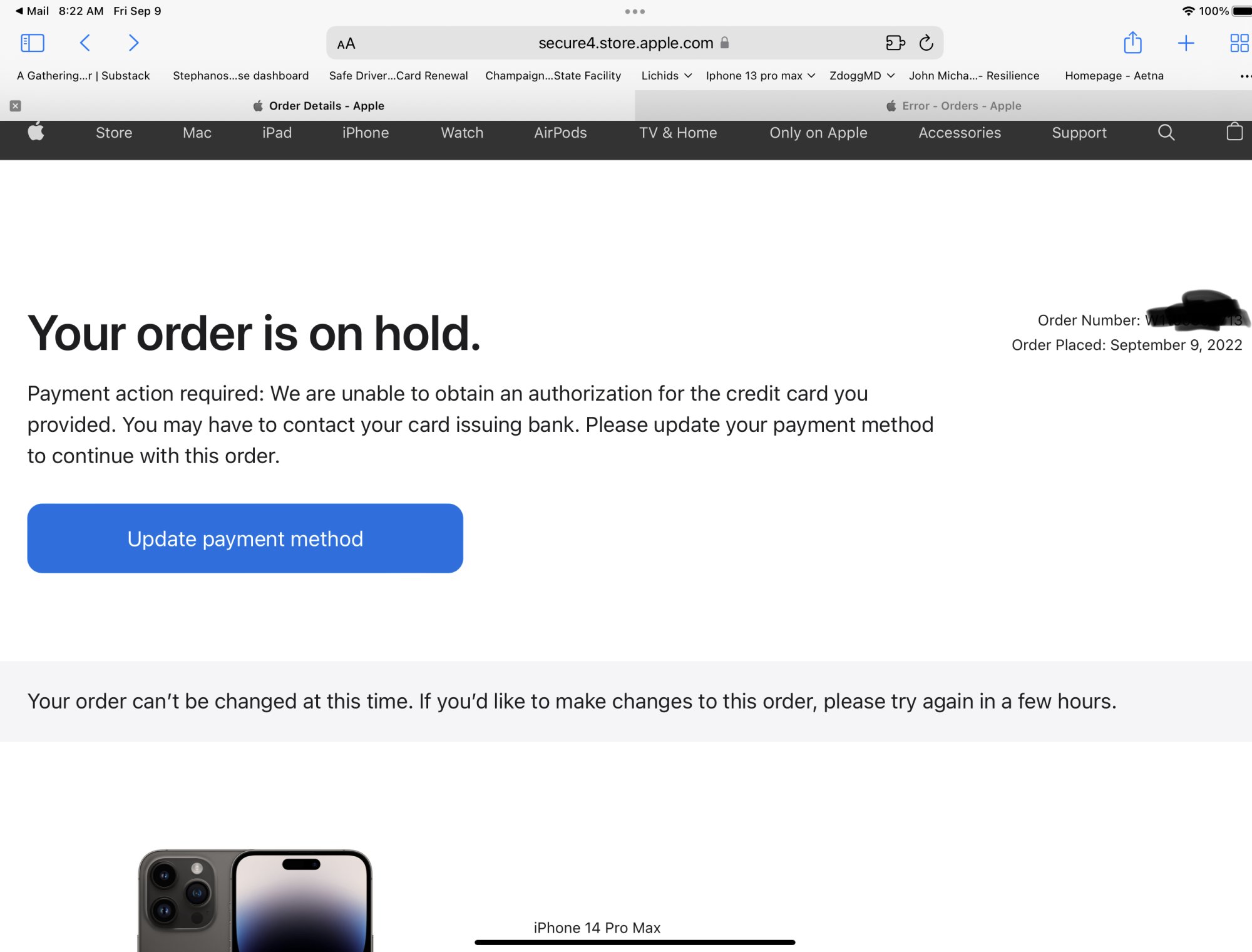 Well here is my status even though I checked and got my card info updated apple somehow grabbed from somewhere my old card. I had it updated for the pre pre approval and the loan thing went through so I assume it went to the new card. But when I clicked the order went, gave me email it was ordered and then later said on hold and I need to update payment info of course the system is bogged down cannot check to update it from order page