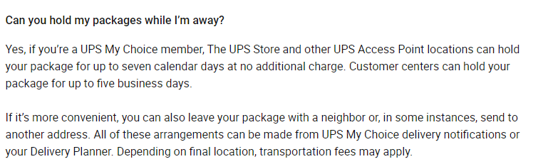 Here you go. You have to be a UPS My Choice member. I believe it is 7 days.Anyone every put a vacation hold for UPS with an iPhone order? I'll be out of town on 9/16. If so, how long do they hold and redeliver? Or should I just have it sent to UPS Store and pick it up when I get back?