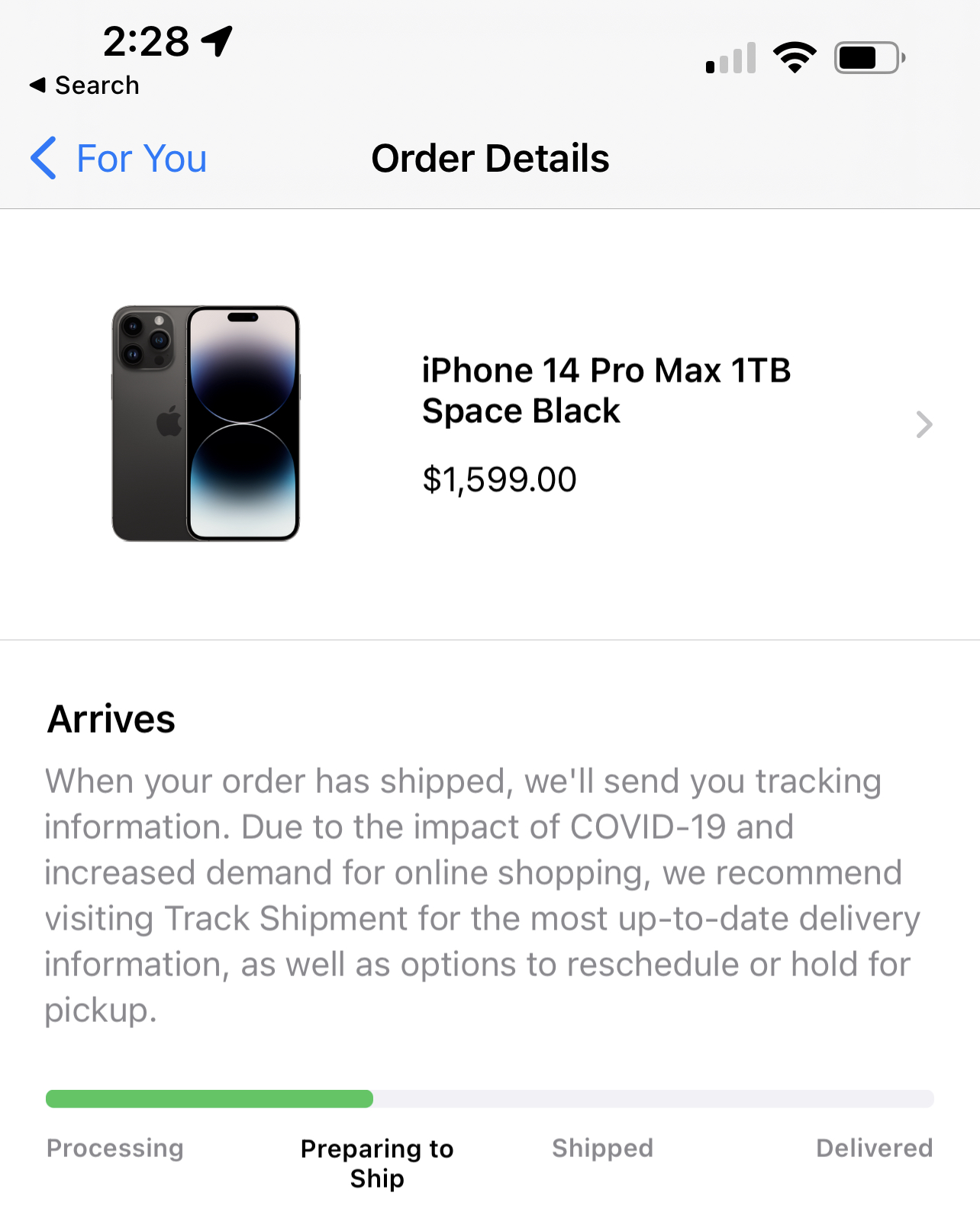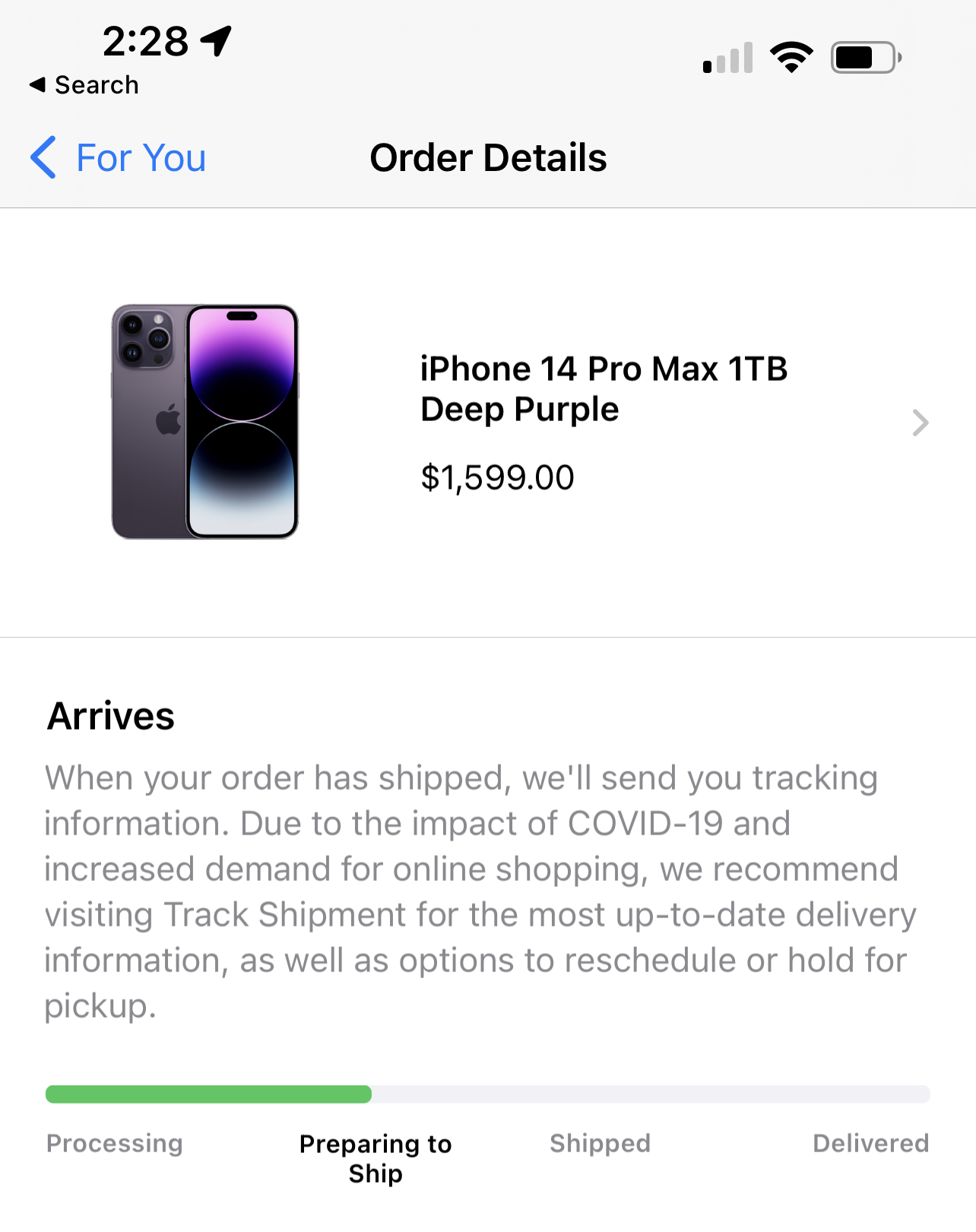 Jesus, dude. Take a breath.Yeah my iPhone 14 pro max 256gb deep purple is coming via usps from apple it’s financed through T-Mobile I am trading in my 13 pro max but my estimated delivery date is October 10th / 17th it is what is but happy the taxes were only around $42 as opposed to going through T-Mobile app which the taxes were $99 plus and apple gave instant credit to be determined by the condition of my 13 pro max which is in great shape where as T-Mobile does the bill credit over 24 months so I will only owe like $479 after my phone trade in is processed not bad sorry for rambling on have a blessed day![]()