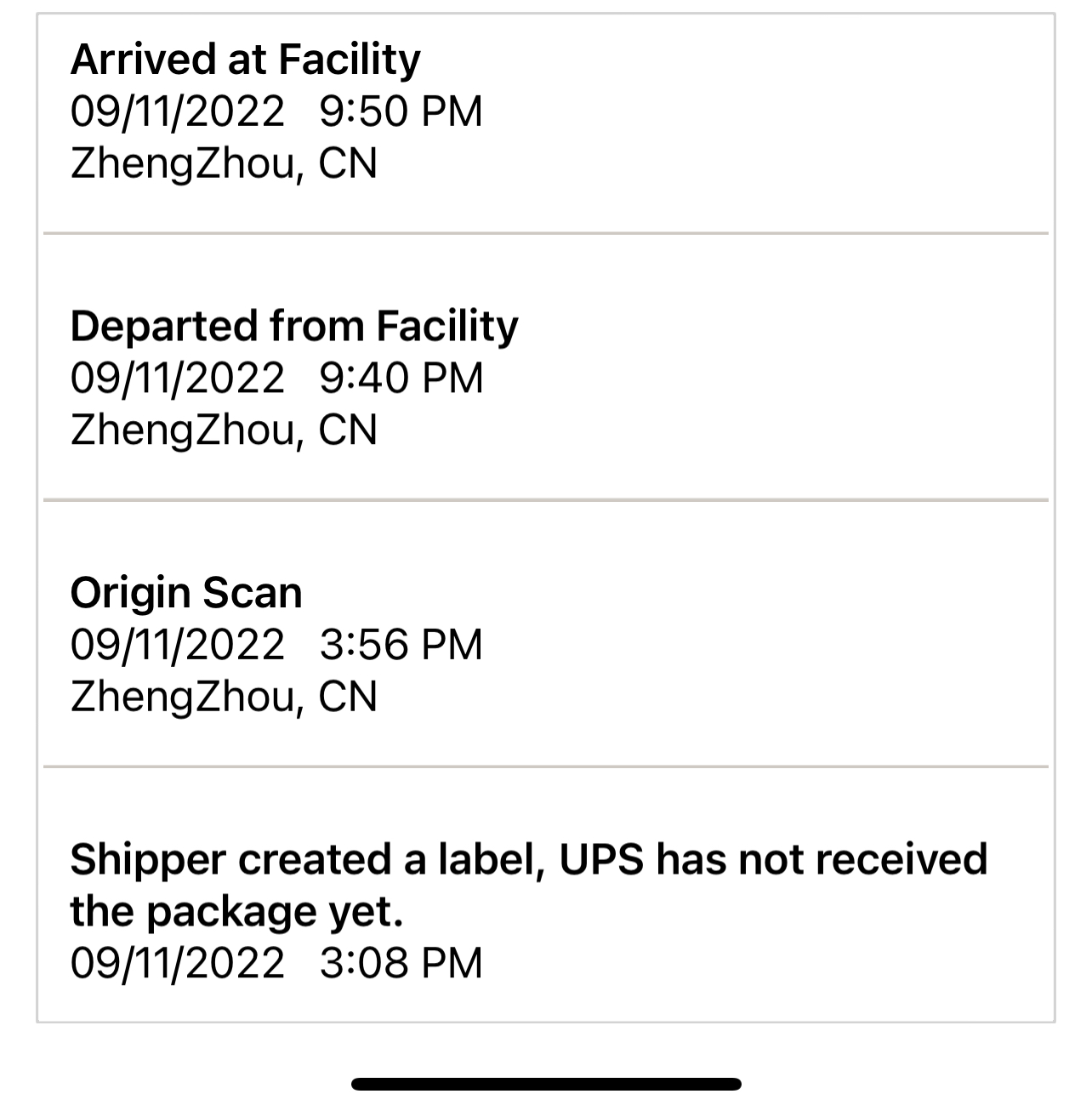 I got a departed from facility scan at 9:40pm and then the arrived at facility at 9:50pm in ZhengZhou, CN