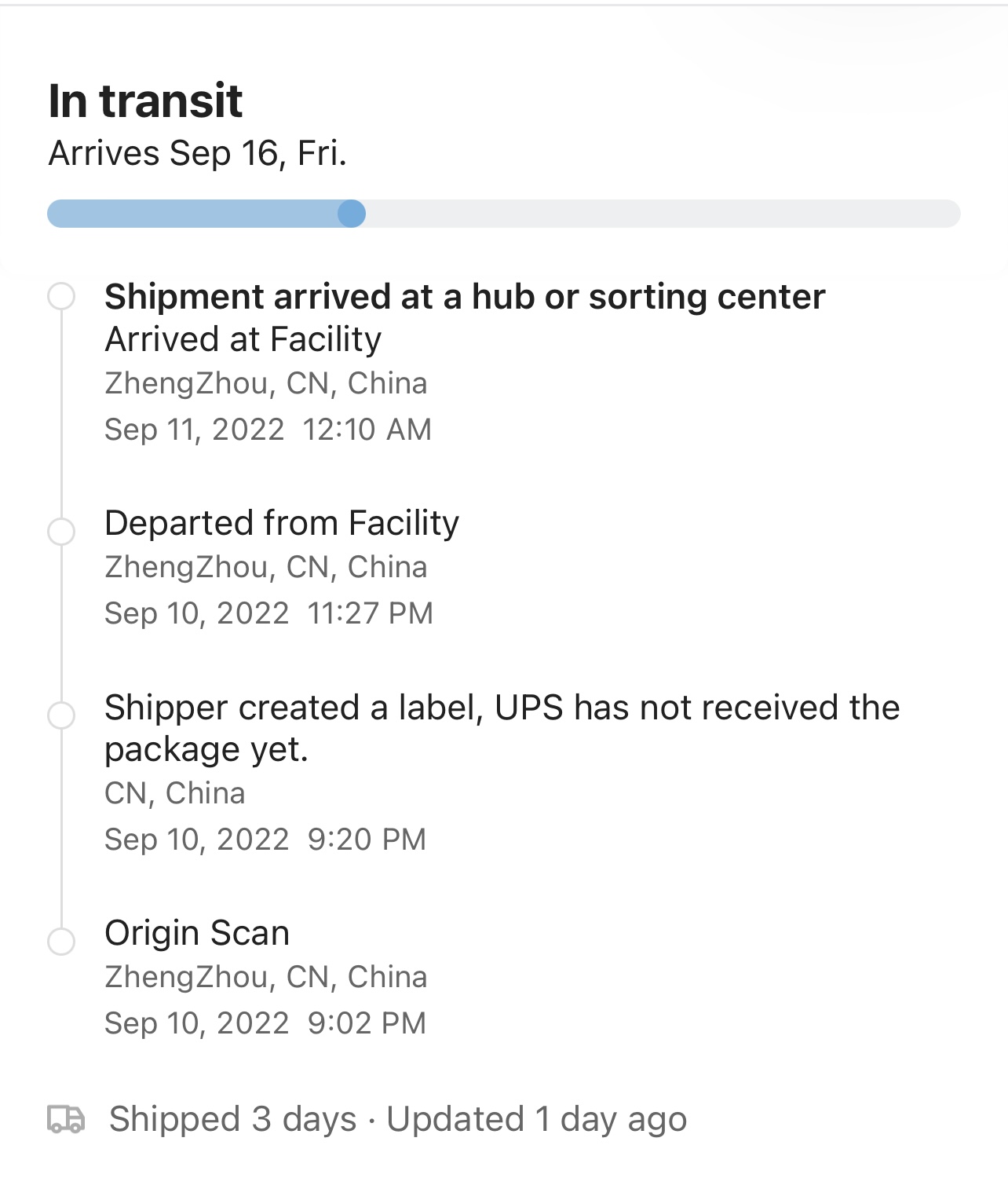 He has the latest iphone 14 feature: teleportation!I just installed the Aftership app and added my UPS tracking info. The app matches what I'm seeing on the UPS website. I'm not sure how this iPhone is already in Louisville when none have left China yet. The tracking in that screenshot doesn't include a departure scan from China or an arrival scan for Alaska.