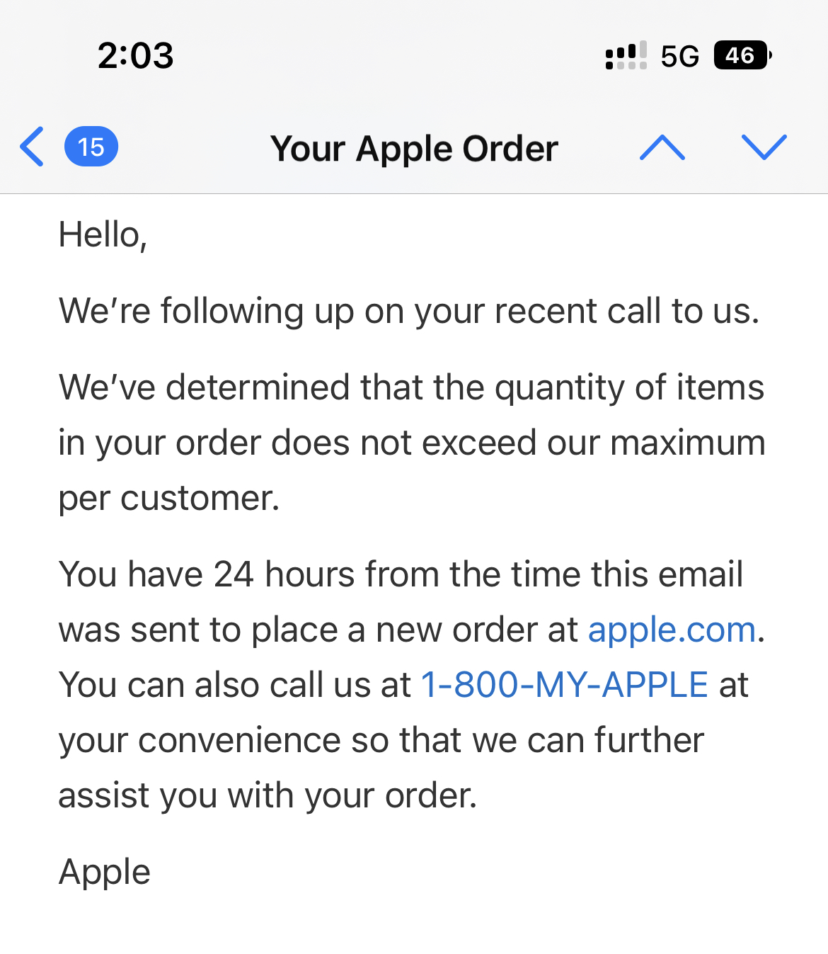 Welp. 3 hours on the phone. 2 days of waiting for higher escalation team to work on the case with undetermined timeline. I finally got a “resolution”.Anyone else had this happen? Apple just send me an email saying they cancelled my order. I ordered via the iPhone upgrade program and only ordered 1….
