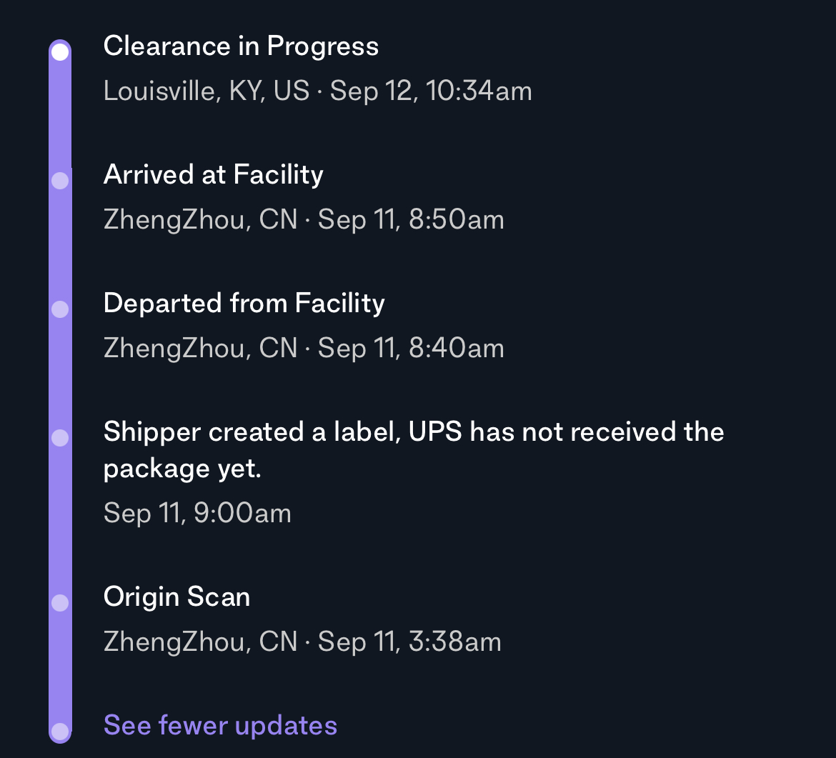 Apple restricts UPS to give that detailed information until it arrives in KY, following up with an Import scan. It's due to the security reasoning.Clearance in Progress shows in Shop app but not UPS, odd!
