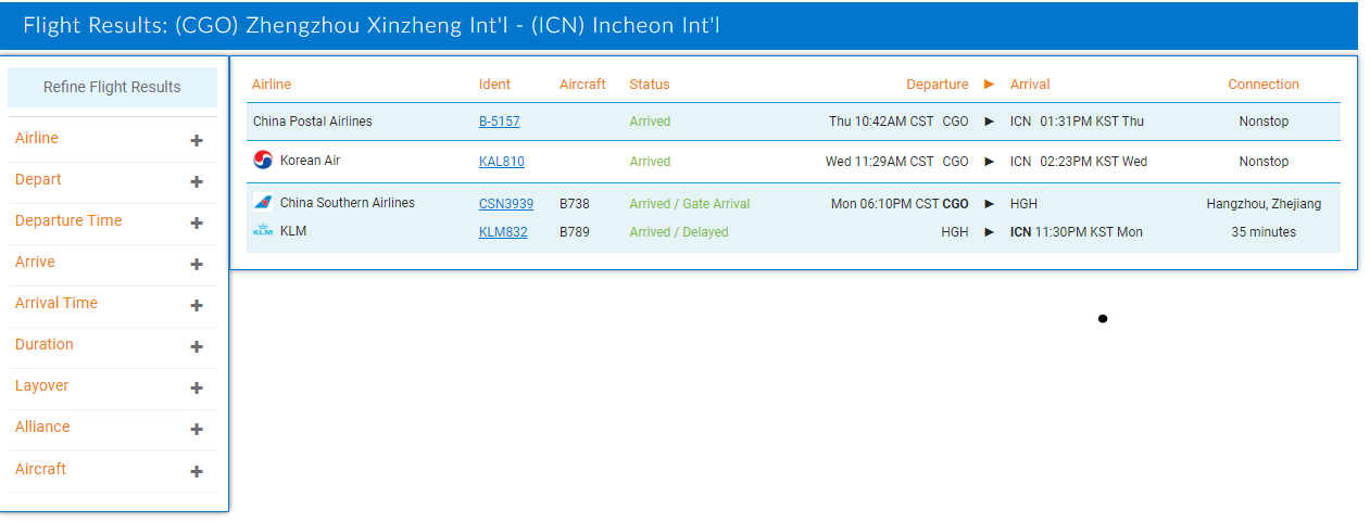 I checked and I couldn't find it earlier either. That's all I see.Am I looking at flightaware wrong or are there no upcoming flights from CGO>ICN??