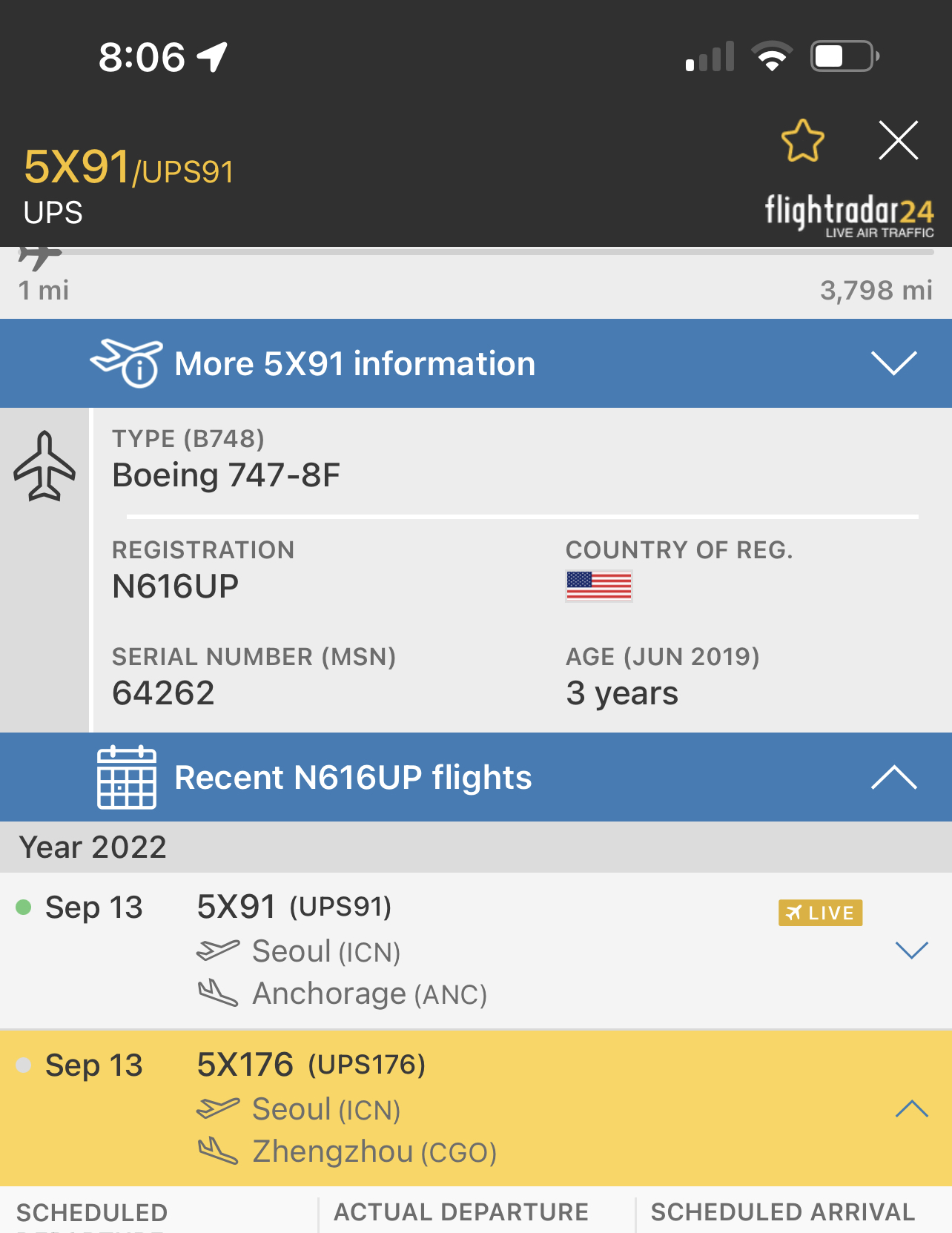 I agree. It is also scheduled to depart from Anchorage, Alaska to Louisville, Kentucky tomorrow within 10 hours. I have a feeling this is our plane.UPS 91, that is about to leave Seoul, started in ZhengZhou. There is no way are are not containers full of phones on that plane.