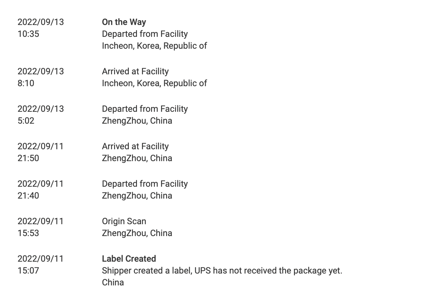 | 09/13/2022 10:35 A.M. | On the Way Departed from Facility Incheon, Korea, Republic of |