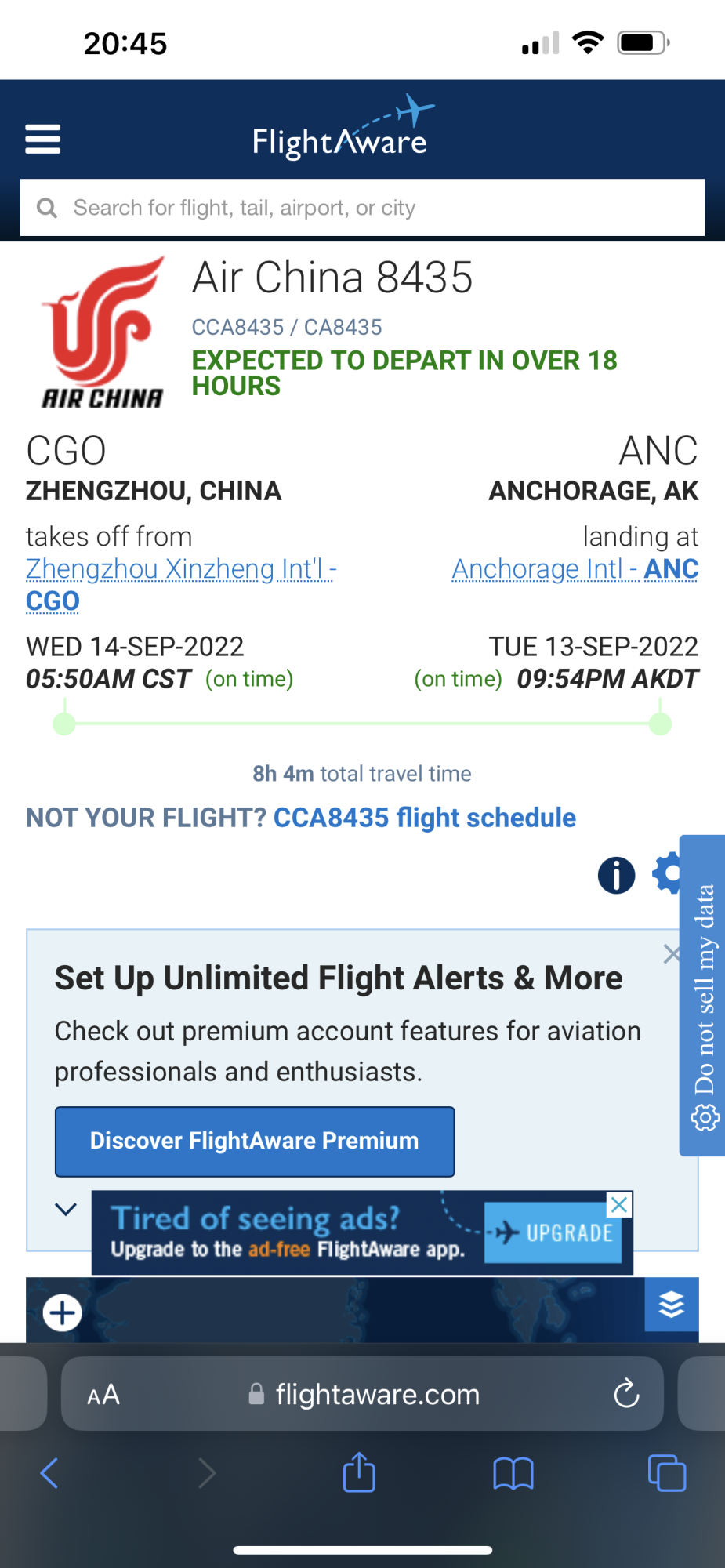 Ummm...this isn't strictly a cargo flight. This is a commercial flight, with passengers on board as well....It could have iPhones in its cargo hold, but very unlikely, as most of that cargo will be passenger luggage...This is the next public / possible cargo flight out of CGO to ANC. So another alternative. Have over 18 hours to departure though.
